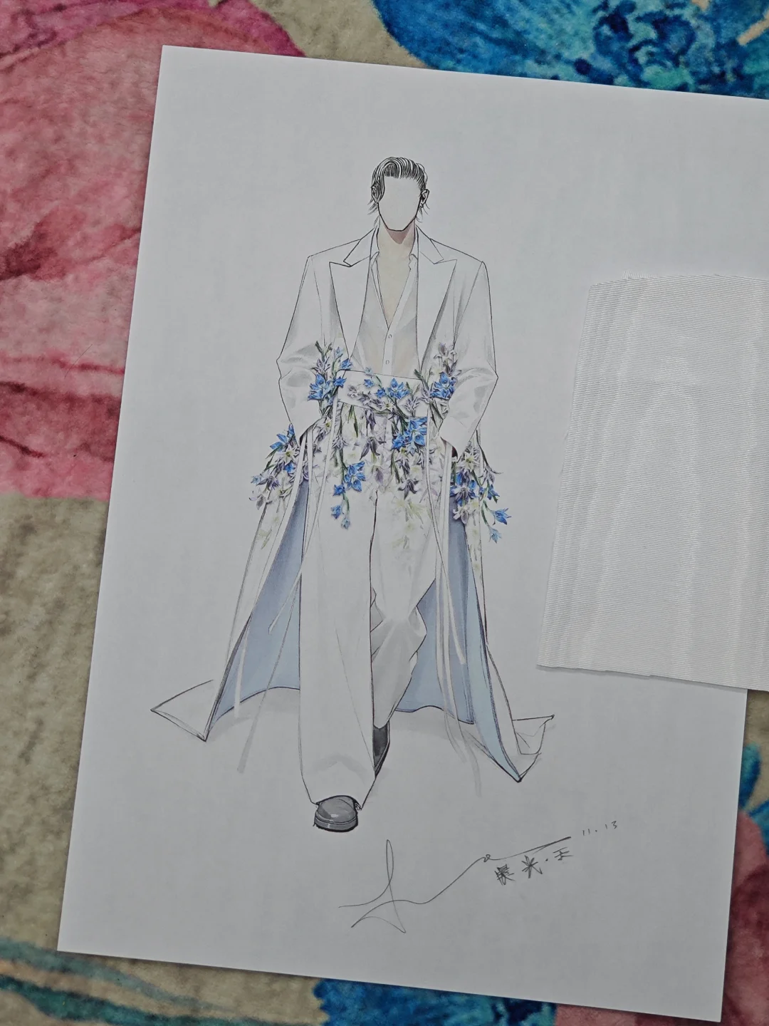 💙圖3,11月13號我畫的第一版手稿,時間真的很緊張,其實也是最終版,因為造型團隊和藝人團隊討論後都很喜歡,所以直接就確定了,只是考慮到舞台安全問題減短了衣長,而且VanNess試裝時候很喜歡這套衣服「嗯~開心」