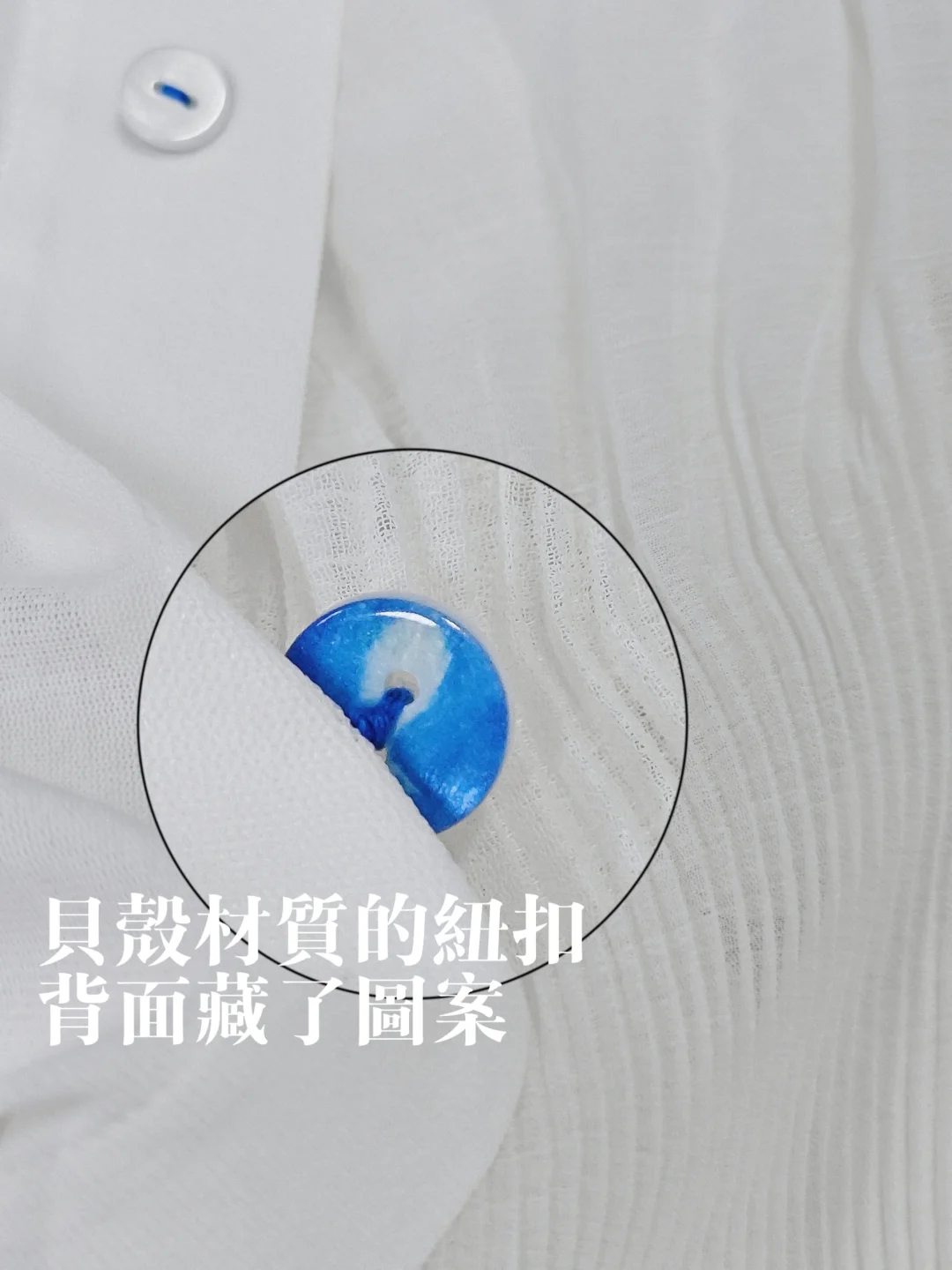 💙圖8,超細節的襯衫紐扣,穿上衣服後大家看到的只是面料相同白色的釦子,但其實我在釦子背面還藏了心思「細心的人應該發現了,圖案是我的頭像,哈」,這是屬於我很個人的想法,也許沒什麼意義,但我希望穿我衣服的人能不經意間發現藏在衣服裡的小細節,能為自己帶來一絲欣喜[害羞R]