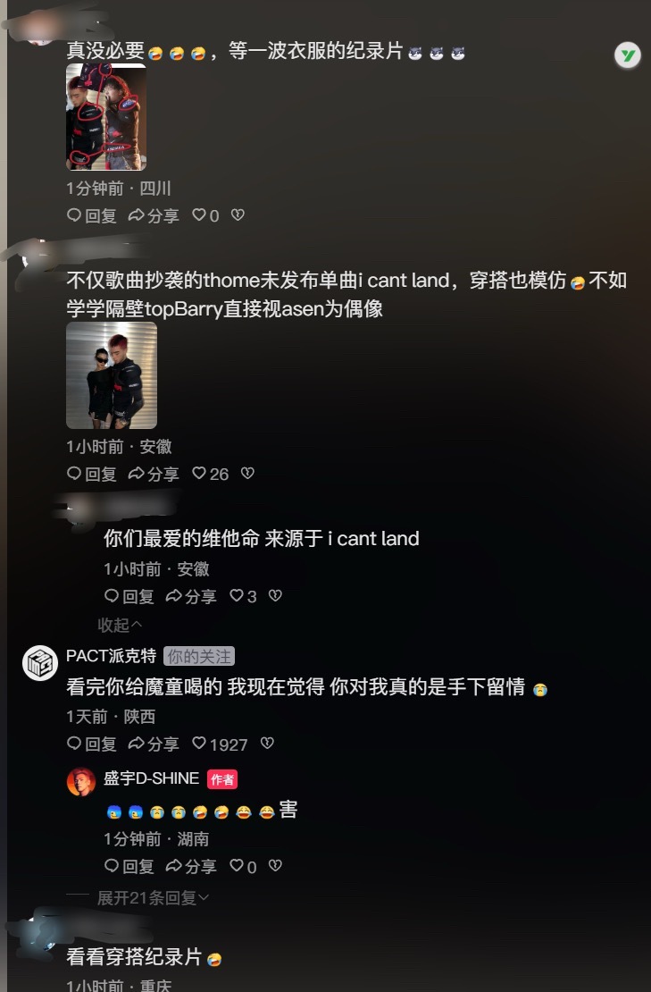 泰格西最新演出造型撞了Thome引发争议!网友质疑其抄袭,还用贴布挡住Thome的名字!Thome直接晒出两人的造型对比,配文:😂Ps.今年9月偷米还曾点名泰格西新歌和自己demo一模一样!泰格西