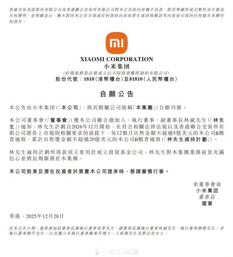 小米集团公告称,联合创始人林斌计划自 2026 年 12 月起,每年减持不超过 5 亿美元的公司 B 类普通股,累计不超过 20 亿美元。所得款项将用于成立投资基金公司。小米集团308_IO新能源汽车