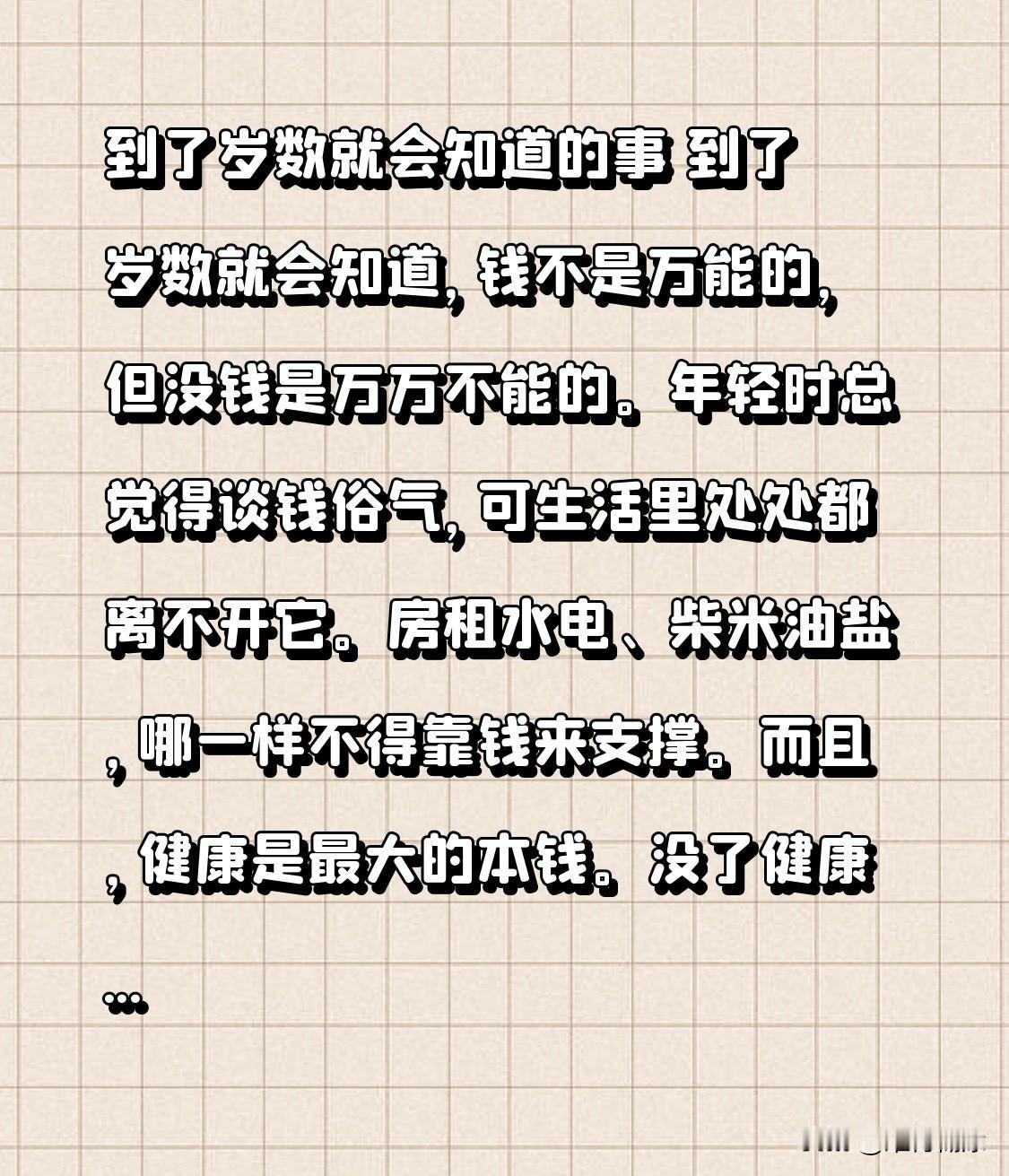 到了岁数就会知道的事 到了岁数就会知道,钱不是万能的,但没钱是万万不能的。年轻时总觉得谈钱俗气,可生活里处处都离不开它。房租水电、柴米油盐,哪一样不得靠钱来支撑。 而且,健康是最大的本钱。没了健康,一切都是浮云。年轻时熬夜、胡吃海喝,身体还能扛得住,岁数大了,各种毛病就找上门来。所以啊,珍惜当下,多赚钱,多养生。
