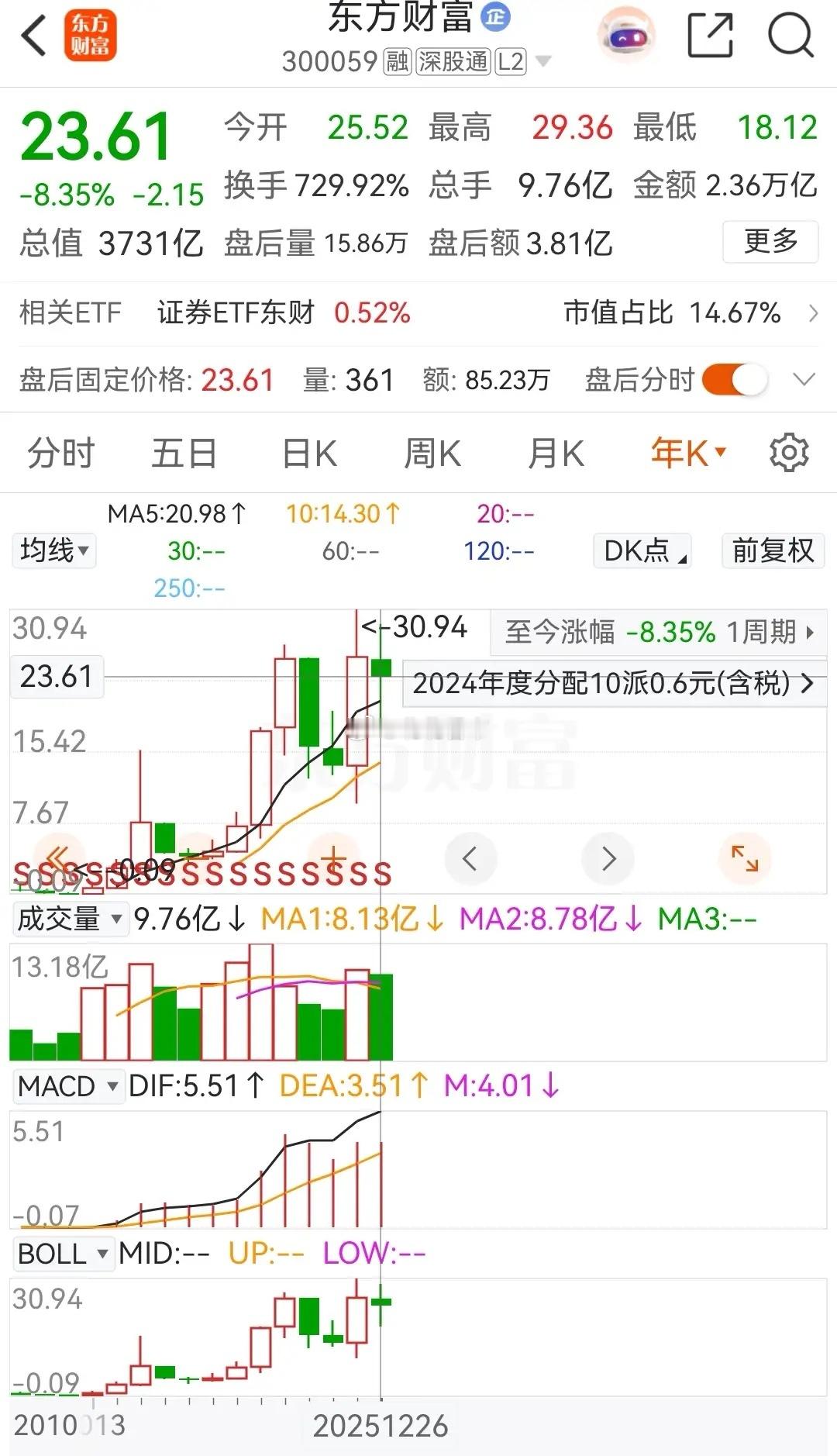 东方财富、同花顺和指南针,三只创业板交易的券商概念股,在2025年的表现对比:指南针涨幅为 104.24%,可以说是遥遥领先,其次是同花顺,最差的是东方财富。股价表现与市场情绪:指南针在年内的涨幅最高,截止当前为 104.24%,显著跑赢同行,此外,年线还是五连阳;同花顺涨幅在14.67%,表现稳健但弱于指南针;东方财富涨幅最低,目前则是下跌了 8.35%,走势疲软,若是年底最后三个交易日收不回的话,那2025年的年线就要收绿了。在业绩增速方面:指南针的净利润增速爆发,今年上半年同比大增 391% ,主要是受益于证券业务并表及AI驱动的用户转化;东方财富的营收和利润基数最大,上半年净利润达 55.67 亿元,同比增长了37.27%,展现持续盈利能力;而同花顺今年上半年的净利润则为 5.02亿元,同比增长38.29%,增长稳定。目前,券商概念板块连续三天收阳,且成交量稳步放大,一切都在向好的方面发展,年底有望带领指数回到四千点上方。