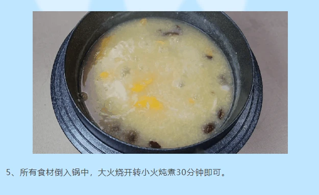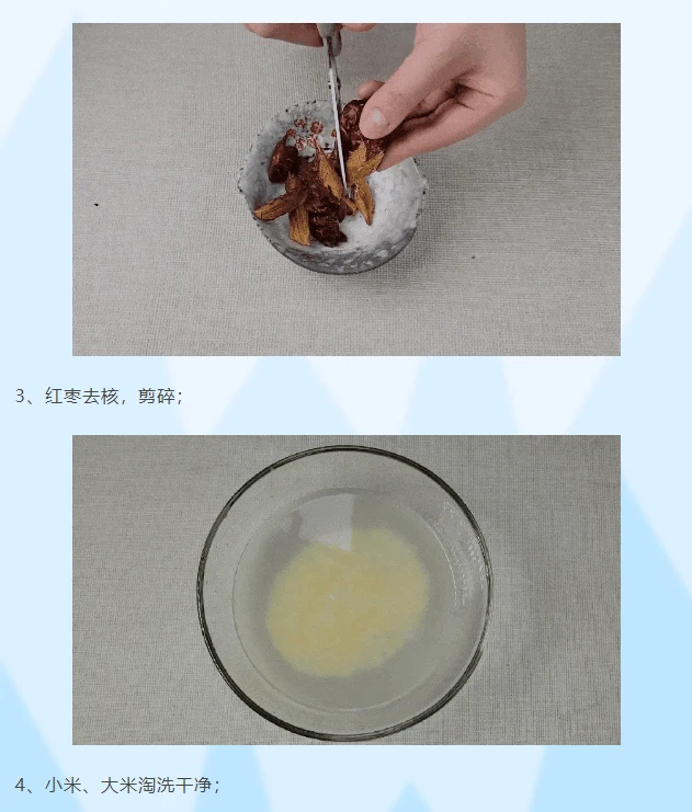 红薯1个、铁棍山药100g、小米50g、大米50g、红枣3枚、桂圆5颗