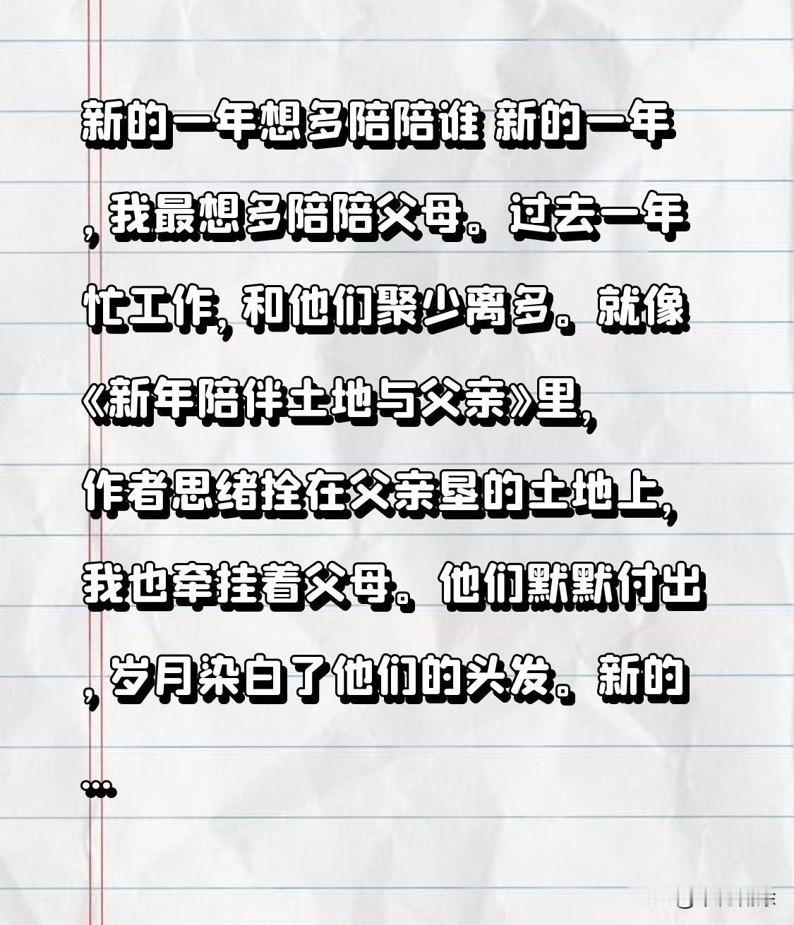新的一年想多陪陪谁 新的一年,我最想多陪陪父母。过去一年忙工作,和他们聚少离多。就像《新年陪伴土地与父亲》里,作者思绪拴在父亲垦的土地上,我也牵挂着父母。他们默默付出,岁月染白了他们的头发。新的一年,告别内耗,努力工作,多抽时间陪他们,让他们不再孤单,愿他们生活幸福,所行皆坦途。