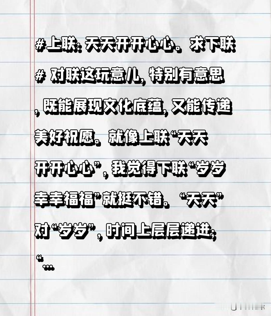 对联这玩意儿,特别有意思,既能展现文化底蕴,又能传递美好祝愿。就像上联“天天开开心心”,我觉得下联“岁岁幸幸福福”就挺不错。“天天”对“岁岁”,时间上层层递进;“开开心心”和“幸幸福福”都是咱对生活的美好期盼。这就跟祝寿联“人近百年犹赤子;天留二老看玄孙”一样,简单却满是温情。