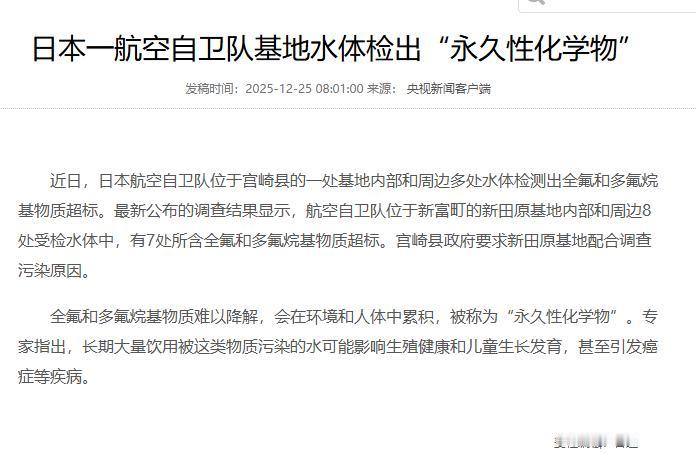 快报!快报 日本突然宣布了 12月25日,日本航空自卫队新田原基地被曝出大问题。基地里面和周围取了8处水样检测,结果7处都超标了。超的是全氟和多氟烷基物质,就是那种很难分解的“永久化学品”。 日本这回自己给自己挖了个坑,还踩了进去,12月25日,日本防卫省自己承认了件挺扎心的事:他们航空自卫队的一个基地出问题了,还是那种说出口都让人倒胃口的环保事故。 事发地是宫崎县的一个军事基地,听上去挺不起眼,但这事闹得可不小,简单说,基地周边的水里发现了有毒物质,还是那种一旦进了水,几十年都不消停的“永久化学品”。 这类物质名字挺长,普通人听着也没概念,但用处不少,过去经常出现在各种防水材料、厨房用品里,后来被军队广泛拿来灭火。 说它“永久”,不是夸它厉害,而是根本清不掉,一旦进入环境,特别是水源,那就几乎是“跟一辈子”了,这次日本官方承认,水里确实发现了它,而且不是一点点,是“超了头”。 关键在于,这不是头一回发现问题,而是污染一直在那儿,结果现在越查越严重,这就不只是个“意外”,更像是个已经被忽视太久的老病。 你想想,军队的基地本该是最严控的区域,结果连这么个地方都出了环保事故,那别的地方呢?是不是更没保障?这事一出,直接把日本防卫体系的另一个短板给暴露了。 以前一提这种环保事故,日本人第一反应往往是:是不是美军干的?特别是驻日美军基地附近,早就被爆出过不少类似问题,但这回不一样,出问题的是日本自己的军队。 这就让人没地方推锅了,只能自己解决,这也让很多人意识到,原来问题不光出在别人头上,自家也有不少“看不见”的疏漏。 而且,按照日本政府自己的说法,这种化学物质对人体健康影响不小,长期接触可能带来各种麻烦,它一旦进了身体,就很难排出来,积着积着就可能出事。 更别说这次是在水源里发现的,喝水、洗菜、种田,哪一样不靠水?一想到这些毒物可能已经到了老百姓的嘴边,谁还能安心? 说到底,这不是一两天能解决的事。这种污染,不是你今天关了水龙头明天就能好,它在地下水里,可能已经渗透到土壤深处了。 清理起来,动辄就是几年、十几年,甚至几十年。这可不是换个管道或者铺层水泥就能搞定的,这就是“永久化学品”的可怕之处,你越想忽视,它越黏着不走。 更让人觉得别扭的是,日本政府的反应显得慢半拍,水样早就采集了,结果拖到现在才公布,这种“慢一拍”的操作,难免让人怀疑是不是有人想压消息。 而这种做法,在环保问题上最招人反感,毕竟,老百姓最怕的不是问题本身,而是被瞒着。 如果一个军队基地都能出现这种长时间没人发现或者没人处理的污染,那其他地方的情况就更让人担心了。 问题还在于,日本目前对这种化学物质的管理标准并不算严格,虽然有一些指导意见,但很多都属于“建议性质”,也就是说,听不听、怎么听,全看各自的“自觉”。 这就像是给人定了个规矩,但不设处罚,不检查,不强制,那规矩就只能挂在墙上,没人真把它当回事。 而军方作为管理最封闭、最讲保密的系统,要靠它自己主动公开污染情况,那就更难了,这次事件能曝光出来,还是在地方政府不断要求和舆论关注下被逼出来的。 要是没人盯着,估计这事还会像过去一样被压下去,换句话说,这不是主动作为,这是被迫交代。 再往深里看,其实这类问题背后还藏着更大的矛盾,军事活动本身和环保之间的冲突,在很多国家都存在,训练、演习、设施维护,这些都可能涉及大量化学品使用。 如果没有明确的规范和监管机制,这种“训练优先,环保靠边”的思维就会一直持续下去,尤其是在当前日本不断加强军备、扩建基地的背景下,这类矛盾还可能进一步放大。 而这次事件还有一个地方特别耐人寻味。过去日本人总说,驻日美军基地污染是因为无法进入调查,美军有特权,日本政府也没办法。 但这次是自卫队的基地,想查就能查,结果还是出了问题,这就说明,问题的根源并不全在“查不查”的权限上,更在于是否真正重视环保,是否有一套管得住的制度。 还有一点也值得注意,这种污染不像一般的事故,今天出事明天修复,它是慢性的,隐蔽的,等你发现时可能已经扩散很广。 这就要求政府必须有前置性的防范机制,而不是等出事了再来补救,可惜的是,从这次日本的表现来看,他们显然没做好这方面的准备。 从另一个角度看,这次事件也给其他国家提了个醒,特别是那些同样拥有大量军事设施、长期使用类似化学品的国家,环保问题从来不是别人的问题,它迟早会成为自己的麻烦。 而日本政府现在面临的局面也挺尴尬,一方面国内环保组织和地方民众要求彻查、追责,另一方面军方的保守和制度的漏洞又让彻底调查变得困难重重。 这次污染事件,已经不是环保问题那么简单了,它关系到政府的诚信、军方的责任,还有民众的安全感,说到底,一杯干净的水,不该成为任何人的奢望。