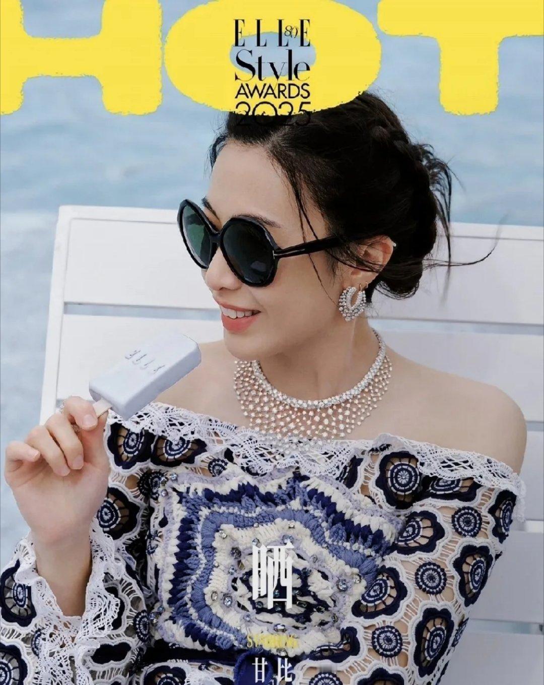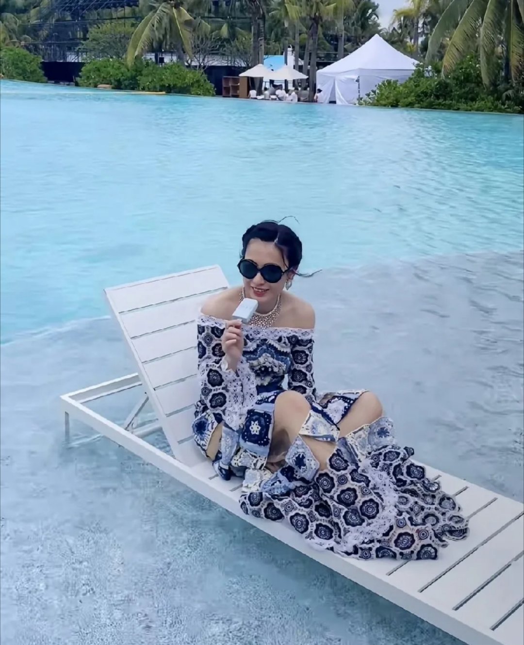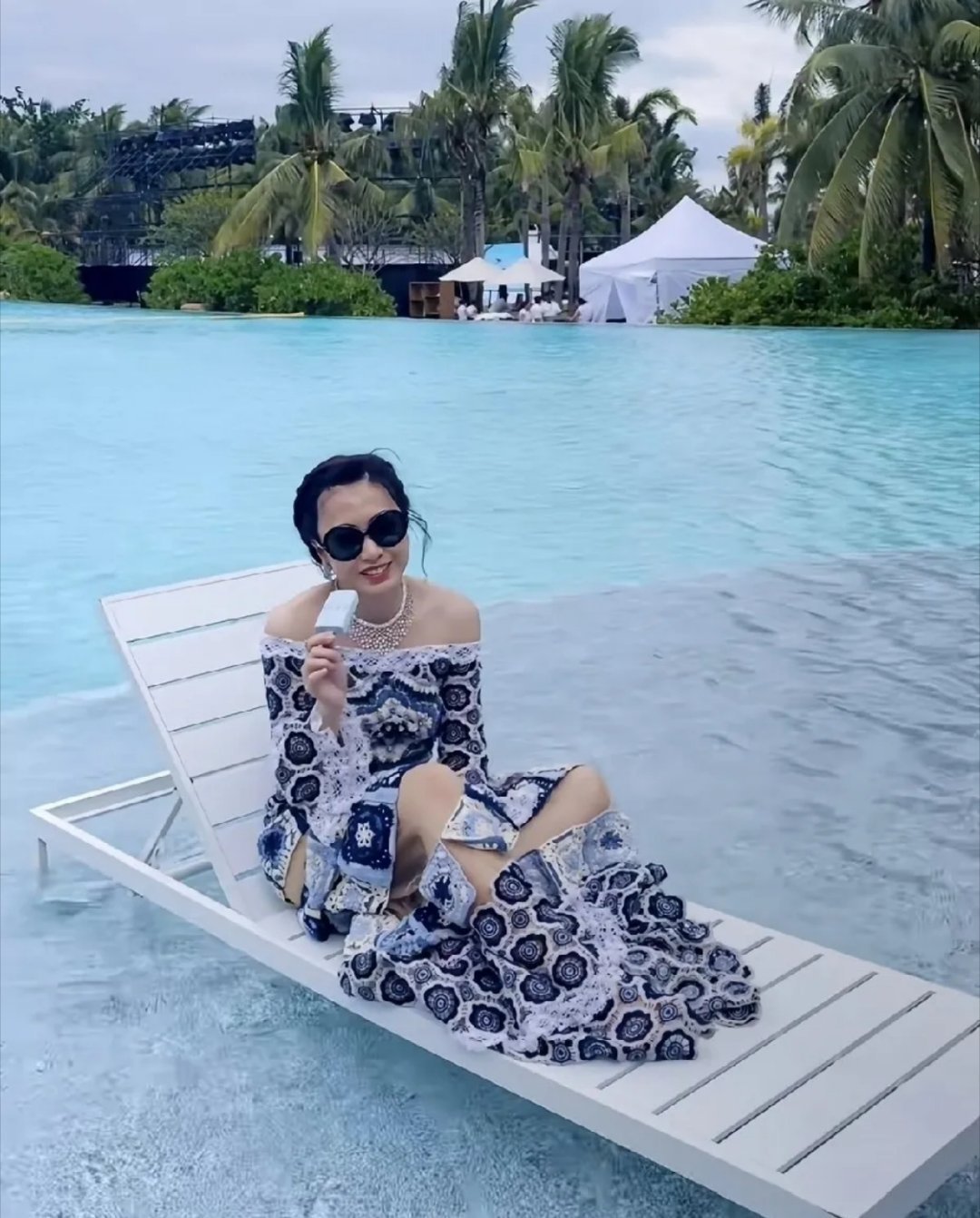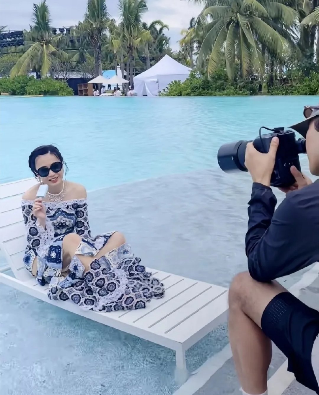 香港富婆甘比晒出酒店泳池边写真,身着亲手钩织的抹胸连衣裙,在摄影师指导下摆着pose,模样十分惬意。