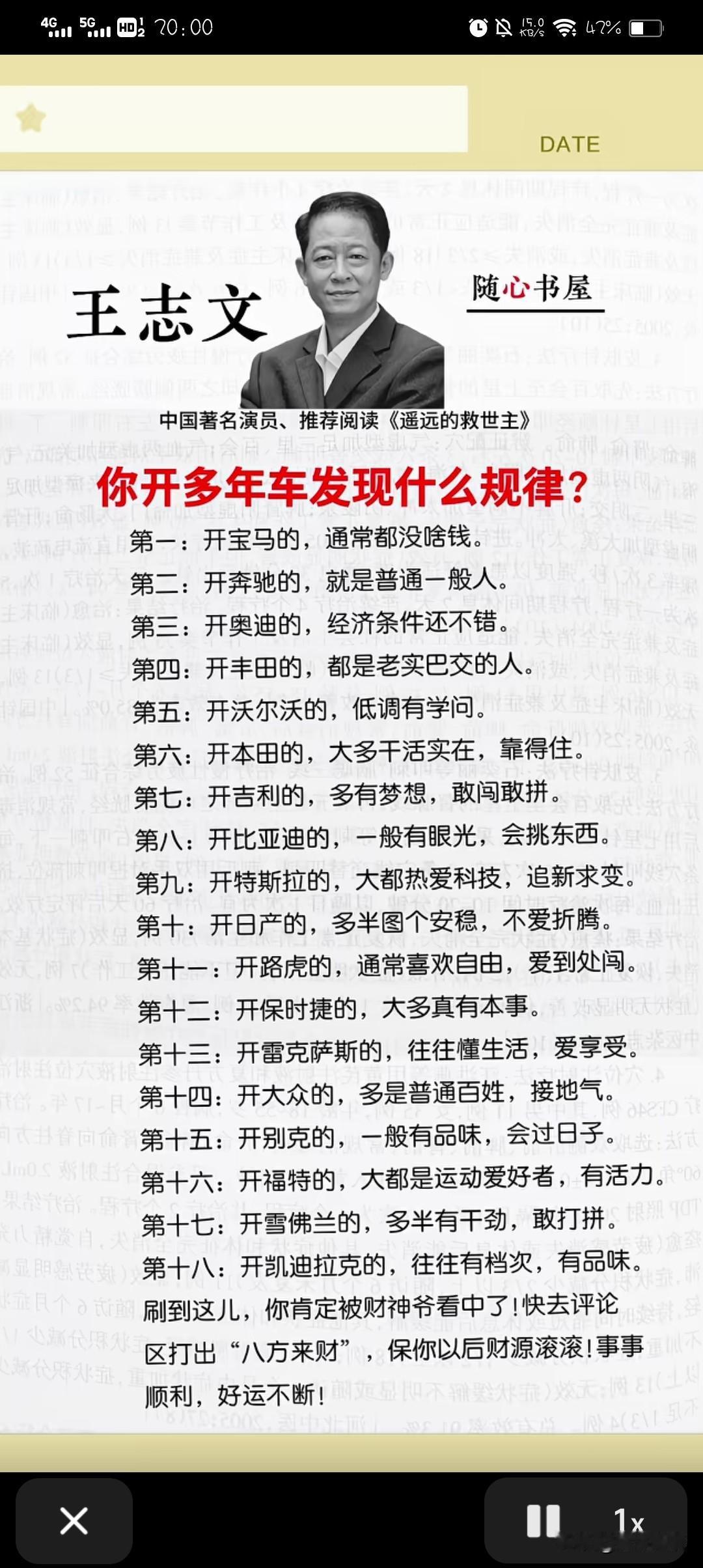 开什么车,就是什么人?按这个逻辑,同品牌车辆的司机,就是同一类人?个人觉得未免太武断了。其实开什么车,最根本的决定性因素还是经济实力的原因,不差钱的当然是开进口的豪车,我们这些口袋里羞涩的人自然是国产车或低价位的代步车,这跟车主的人品、个性、智商的关系不大吧?我见过开豪车的蛮横霸道的司机,也见过开低档车的谦和礼让的司机。即使是众人颇有微词的大货车司机,也有不少文明懂礼的高素质车主。事实上,林子大了,鸟儿众多,有喜鹊,也有麻雀;有秃鹫,也有天鹅,关键是人的秉性差异。一个有修养有涵养的司机,他无论开什么车,都会注重他人的感受;同样,一个唯我独尊的狂妄之徒,无论他的车如何大气、高端,骨子里傲慢的基因是藏不住的,天下人都得让着他,否则总觉得衬不出他的豪横和权势呢。