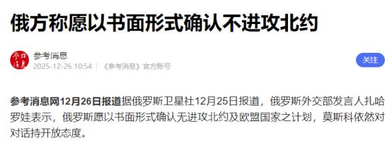 俄罗斯终于让步了!俄罗斯突然甩出一个让全世界都挺意外的重磅提案。俄罗斯外交部发言人扎哈罗娃公开表示,愿意与北约、欧盟签署具有法律效力的“互不侵犯条约”。 这个提案肯定不是凭空冒出来的,得先看看眼下俄乌冲突的情况。现在俄乌冲突都拖到第五年了,12月中旬刚出了个关键消息,乌克兰东部的塞维尔斯克失守了,乌军为了保存实力主动撤了兵。 这地方可是顿涅茨克地区的关键防御点,一旦失守,俄军就相当于撕开了乌军在顿巴斯的“堡垒带”,现在只剩斯洛维扬斯克和克拉马托尔斯克还在乌军手里。 按说俄军这会儿占着战场优势,没必要突然抛出“互不侵犯”的橄榄枝,可偏偏就在这个节点提了,再结合前不久结束的迈阿密会谈,这里面的门道就更清楚了。 12月19号到21号,美俄乌三方在迈阿密搞了穿梭会谈,乌克兰和俄罗斯的代表没直接见面,都是分别跟美国谈。 最后美方和乌方都喊着会谈“富有成效”,俄方代表德米特里耶夫还发了张迈阿密海滩的自拍,配文带个衔橄榄枝的和平鸽,暗示下次会谈说不定能去莫斯科。 可热闹归热闹,这次会谈没取得任何实质性突破,特朗普想要的“圣诞停火”彻底泡汤了。泽连斯基倒是在24号公布了20点和平计划,说要西方给乌克兰类似北约第五条的安全保障,还提了加入欧盟的事,但俄罗斯这边一直没回应。 就在大家都等着俄罗斯对这份和平计划表态的时候,扎哈罗娃突然抛出互不侵犯条约的提案,这明摆着是俄罗斯要自己定谈判框架,不想被泽连斯基的计划牵着鼻子走。 当然,俄罗斯愿意提这个提案,说白了也是被现实压力逼的,所谓的“让步”,其实是深思熟虑后的战略选择。俄乌冲突打了五年,俄罗斯虽然在战场上有进展,但长期消耗下来也快扛不住了。 军事上,兵员折损、装备磨损越来越严重,欧盟还在不停加码制裁,第17轮制裁刚落地,重点盯着俄罗斯的能源出口和军工企业,把342艘石油运输船、苏尔古特油气公司都列进了制裁名单,甚至还搞次级制裁,连白俄罗斯、土耳其的合作企业都要罚,这直接掐住了俄罗斯的财政命脉。 能源出口是俄罗斯的经济支柱,制裁一来,石油运输成本飙升,财政收入大幅减少,国内企业融资难、商品也卖不出去。长期这么耗着,别说推进军事现代化了,国内经济都要被拖垮。 所以俄罗斯想签互不侵犯条约,核心就是想通过外交手段缓和跟西方的关系,先从战争泥潭里抽出身,把精力放在国内经济复苏和军事建设上,这才是最实际的诉求。 更关键的是,这个提案也是俄罗斯在分化美欧联盟,这步棋走得相当妙。这些年欧洲被俄乌冲突坑惨了,军事上要不停给乌克兰输血,资金上还要支援重建,自己国内的能源价格涨得飞起,老百姓怨声载道。 德国总理默茨早就公开对美国的相关文件持怀疑态度,欧盟内部的分歧更是越来越大。10月份的欧盟峰会上,就因为比利时反对,“以俄资乌”的贷款方案直接没通过。 欧洲各国早就想摆脱对美国的依赖,甚至想建一支自己主导的多国部队,只是一直没找到合适的契机。 俄罗斯抛出互不侵犯条约,对欧洲来说诱惑力实在太大了,只要签了约,欧洲就能摆脱战争阴影,不用再给乌克兰砸钱,还能恢复和俄罗斯的能源贸易,降低国内的通胀压力。 可这对美国来说,绝对是噩梦。美国一直想借俄乌冲突削弱俄罗斯,还想靠这事牢牢控制欧洲,要是俄欧真的缓和关系,美国在欧洲的战略空间就会被挤没,霸权地位都会受影响。 不过话说回来,这个提案想落地难度极大,首先就过不了北约这关。北约从冷战结束后就一直在东扩,一步步把防线推到了俄罗斯家门口,这也是俄乌冲突爆发的根源之一。 现在泽连斯基虽然说放弃加入北约的目标,但他的20点和平计划里,还要求西方给乌克兰类似北约的安全保障。而且北约内部被美国绑得死死的,根本不可能答应俄罗斯的要求。 再加上历史上的《苏德互不侵犯条约》摆在那,虽说现在的局势和当年完全不同,但西方对俄罗斯的信任度早就降到了谷底。就算俄罗斯愿意签,北约和欧盟也会担心这是俄罗斯的缓兵之计,怕签了之后俄罗斯转头就撕毁条约,到时候自己反而更被动。 其实这一切都说明,俄乌冲突早就不是简单的领土争端了,而是美俄欧三方的地缘政治博弈。俄罗斯的提案看似是让步,实则是以退为进,既想缓解自身的压力,又想打破当前的僵局,还想分化美欧联盟,可谓一举多得。 接下来就看美欧怎么回应了,要是欧盟真的动心,偷偷和美俄私下接触,那国际格局都可能发生变化;要是美国强行按住欧洲,逼着北约拒绝俄罗斯,那俄乌冲突还得继续拖下去,欧洲的日子只会更难过。