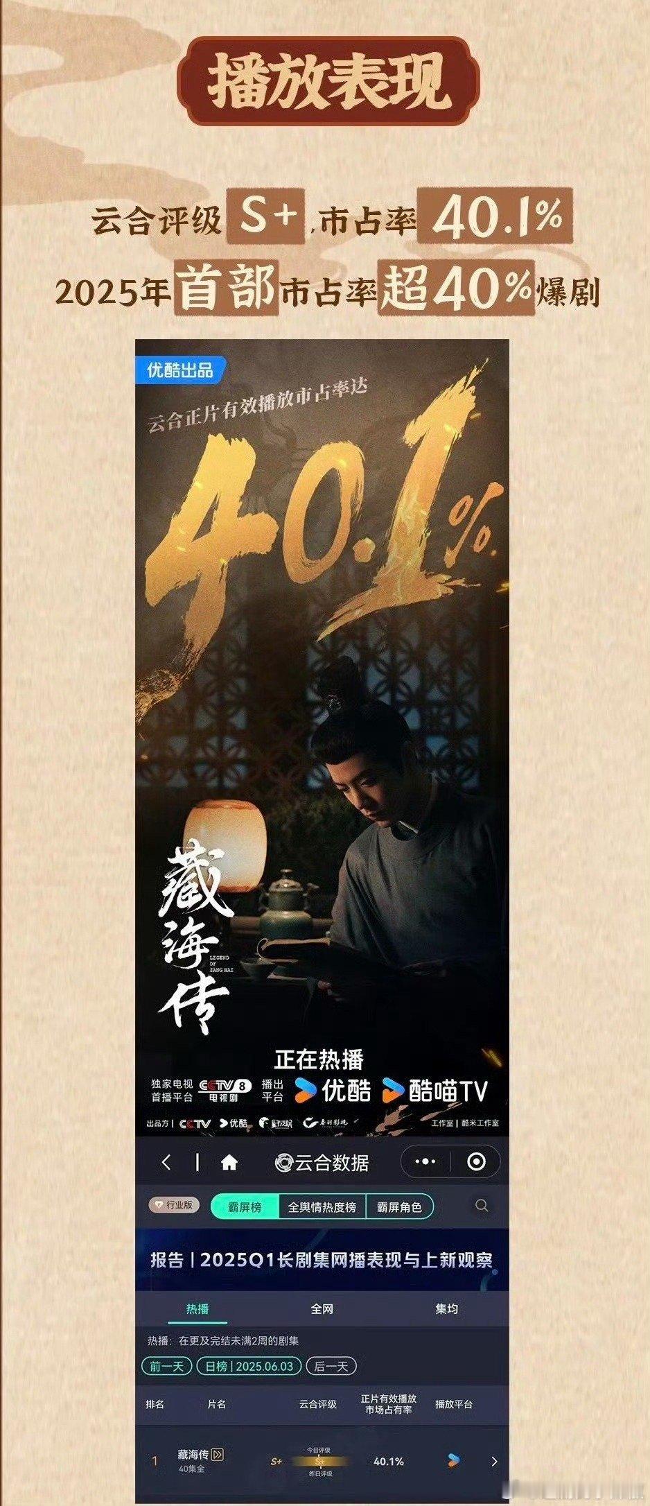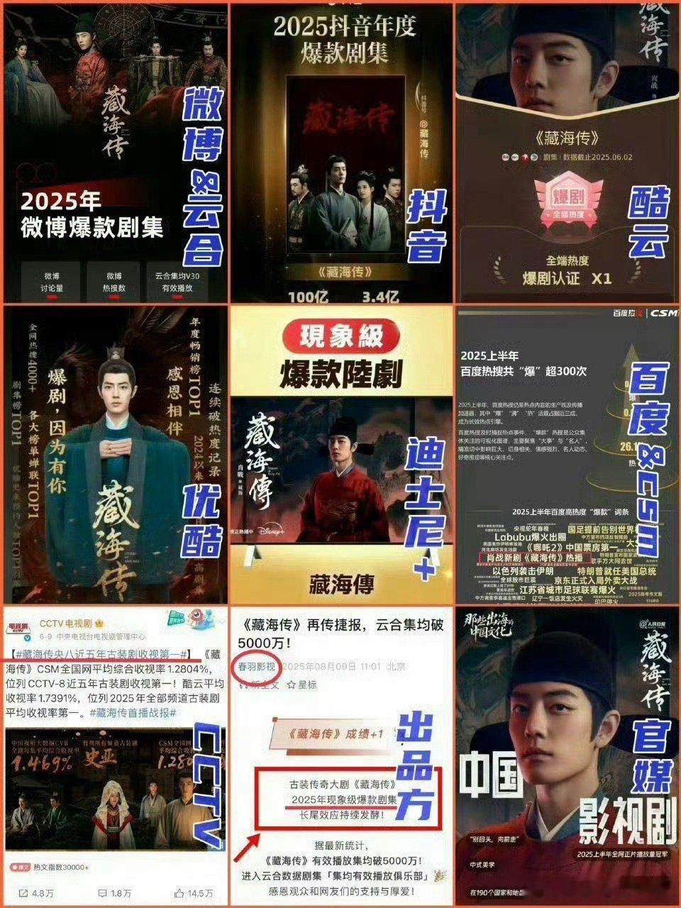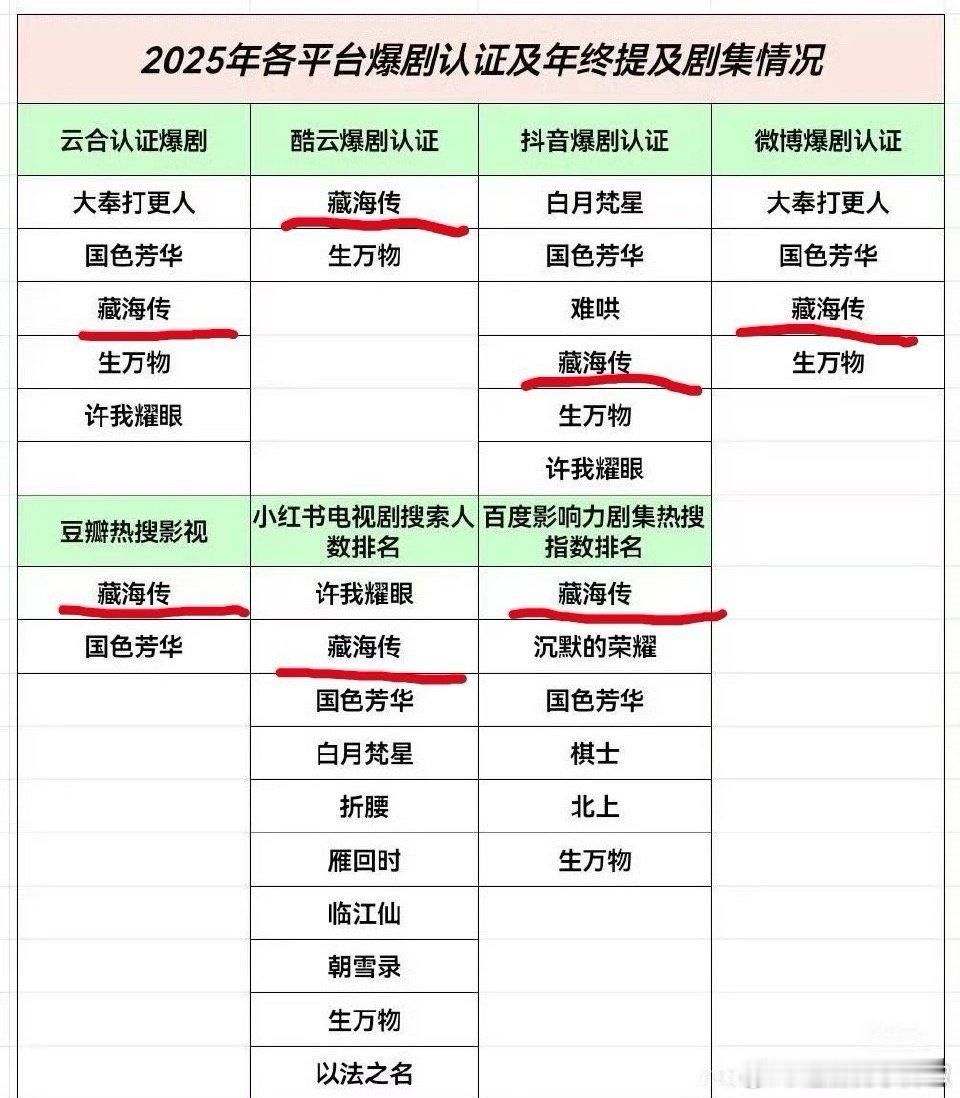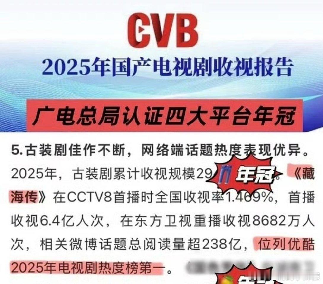 《藏海传》2025剧王当之无愧吧1. 全方位大爆,云合、灯塔、猫眼播放量三榜年冠☝️2. 优酷官方认证现象级爆款🔥热度、招商、拉新、收入史冠3. CVB官方认证25年度收视爆款、热度一骑绝尘🔥4. 百度官方年终报告唯一封面剧集演员。25年度影响力第一剧王☝️5. 金莲花最佳电视剧大奖获得者6. 海外IMAD全球百大电视剧25年唯一上榜 7. 小红🍠官方报告藏海传搜索人数、讨论次数优酷第一☝️全平台年亚