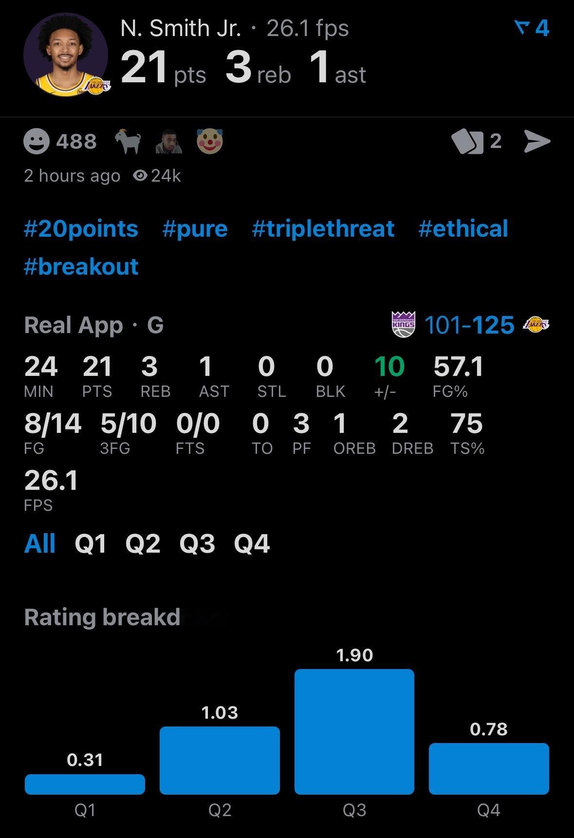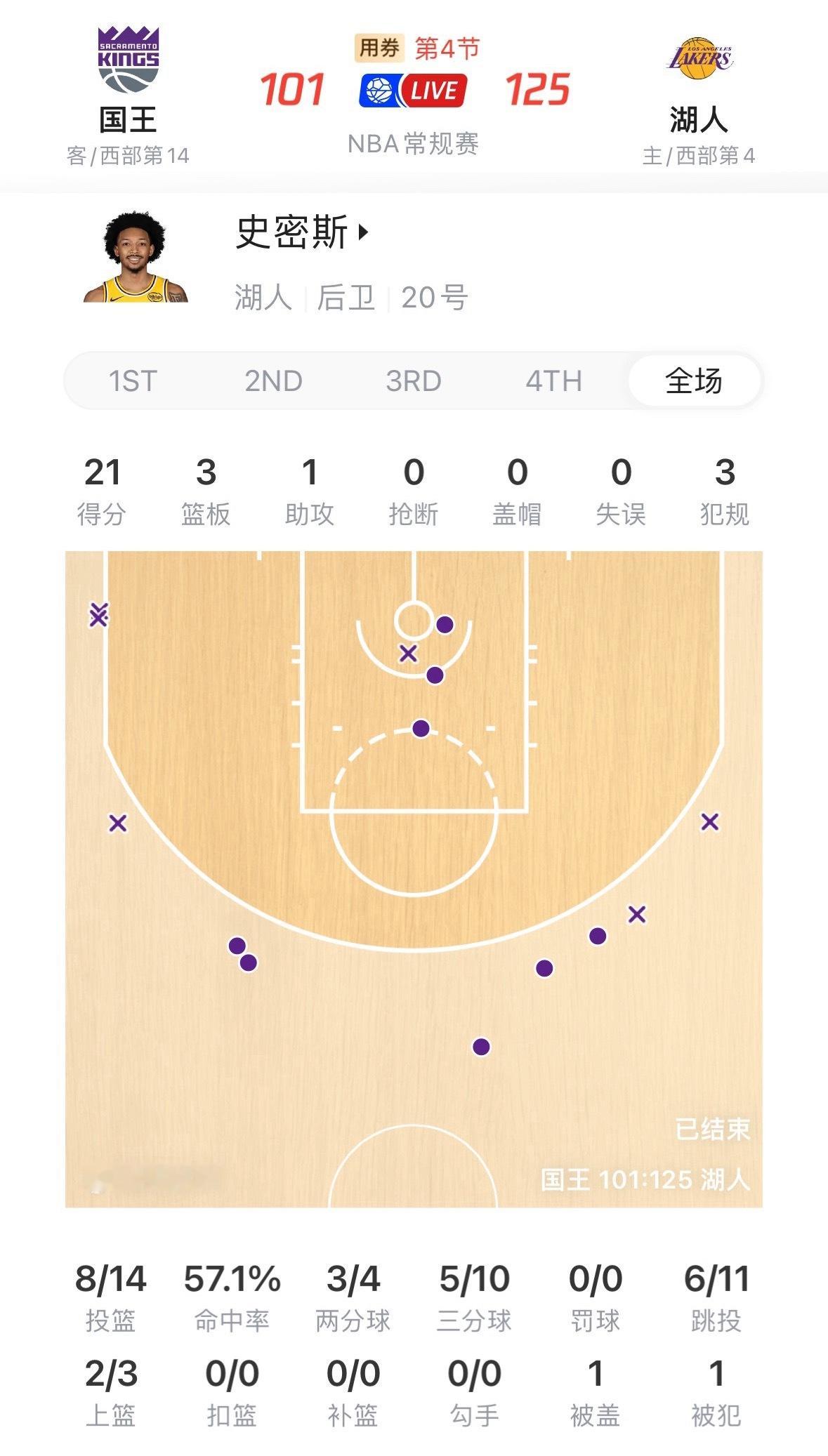 雷迪克谈及尼克-史密斯时表示:“今晚之前,他已经帮球队拿下两场胜利了。而今晚的胜利,他同样功不可没。”奇兵!尼克-史密斯替补出战24分钟,14投8中,三分10中5,0罚球,21分3板0失误,正负值+10。国王vs湖人