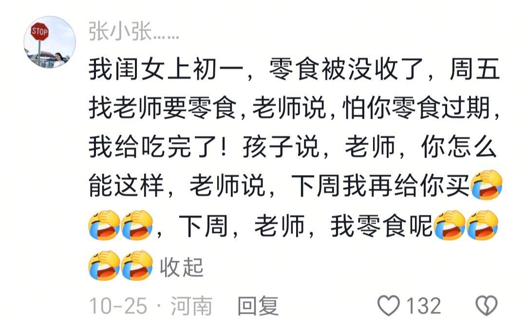 我闺女上初一,零食被没收了,周五找老师要零食,老师说,怕你零食过期,我给吃完了!