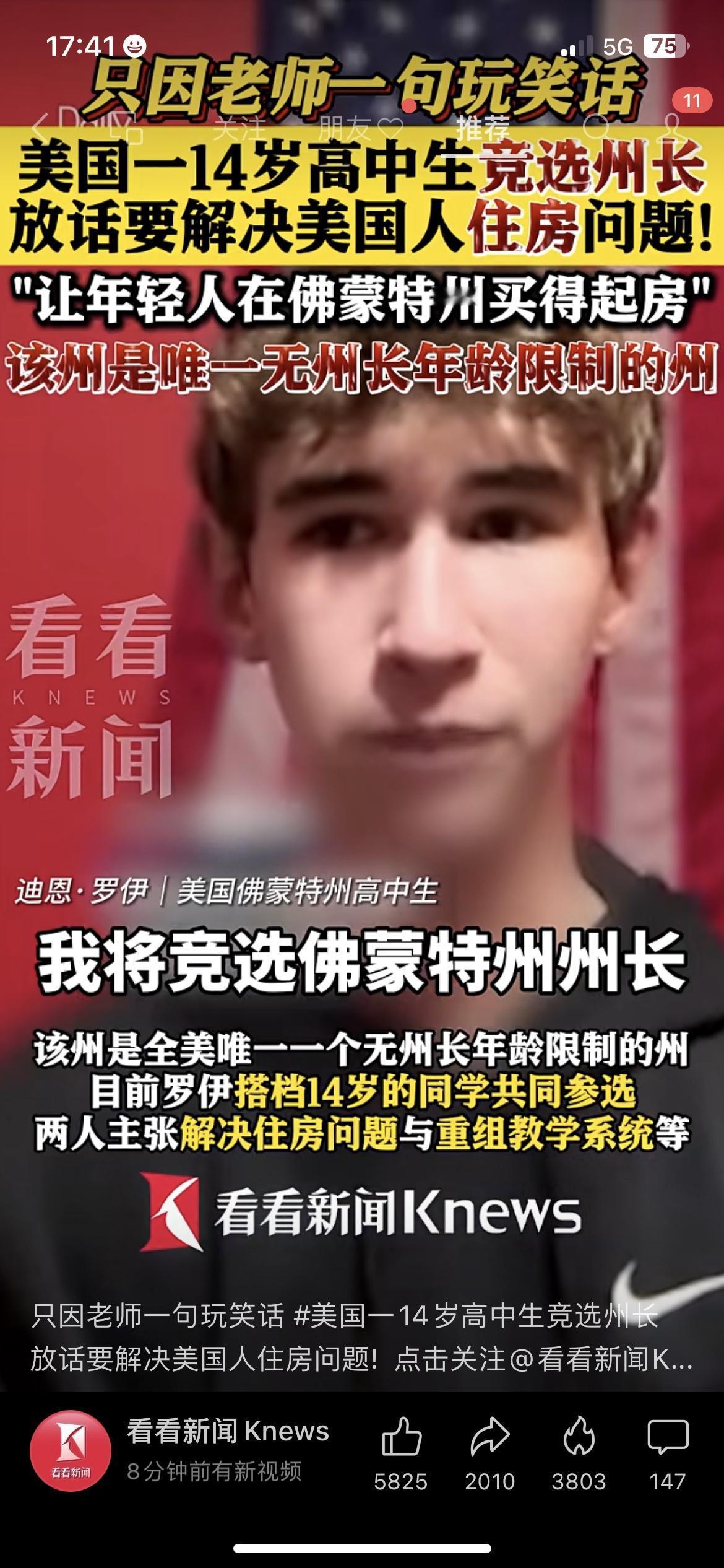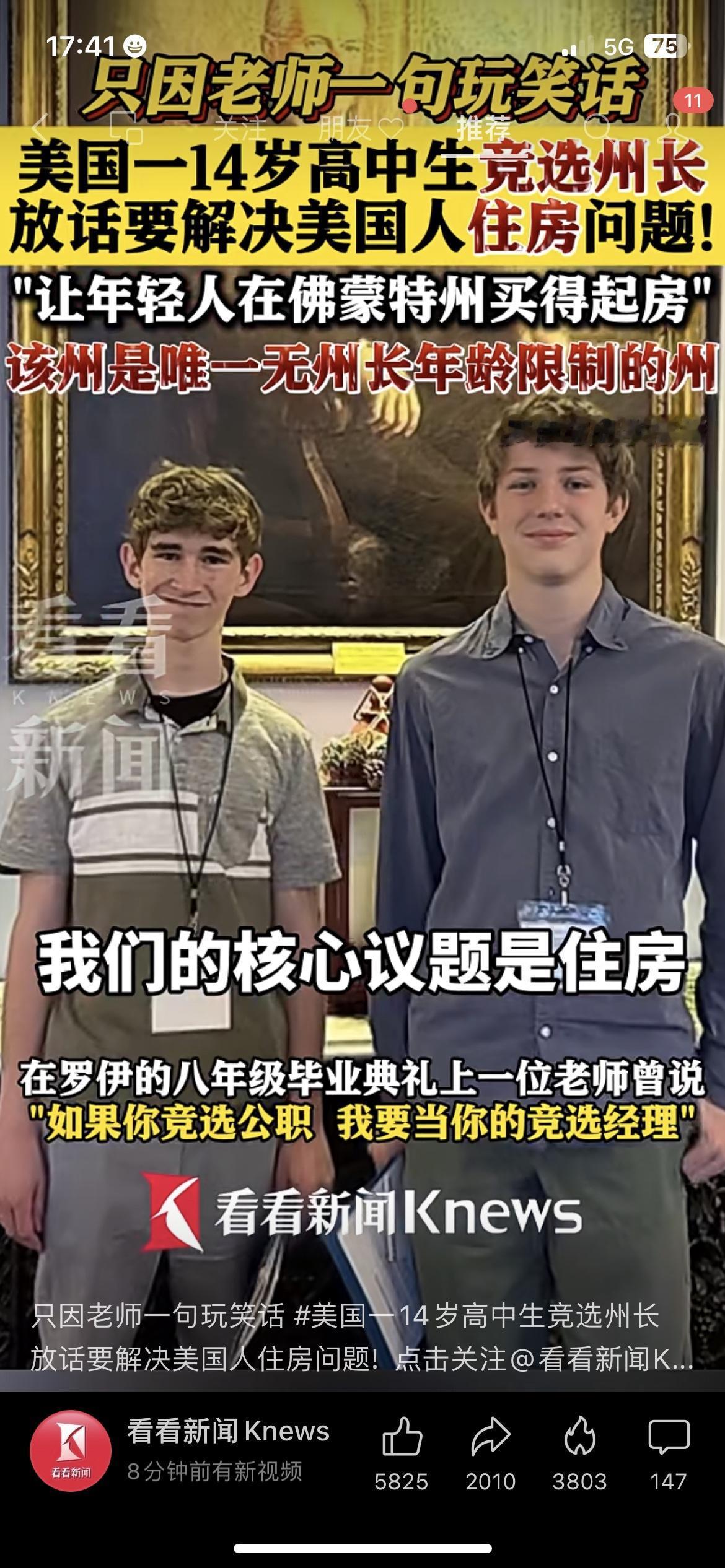离谱又佩服!14岁还在写作业的年纪,美国少年竟竞选州长,就因老师一句玩笑话! 他还把解决住房问题当成核心议题,敢说敢做,而这个州也是全美唯一无州长年龄限制的地方。 邻居家孩子和他同龄,天天刷题备战中考,俩人的成长轨迹反差太大,看着挺新奇。 虽然竞选成功概率渺茫,但这份勇气和担当,真的让人佩服。 你觉得少年竞选有意义吗?年少时你有过什么大胆想法?美国少年