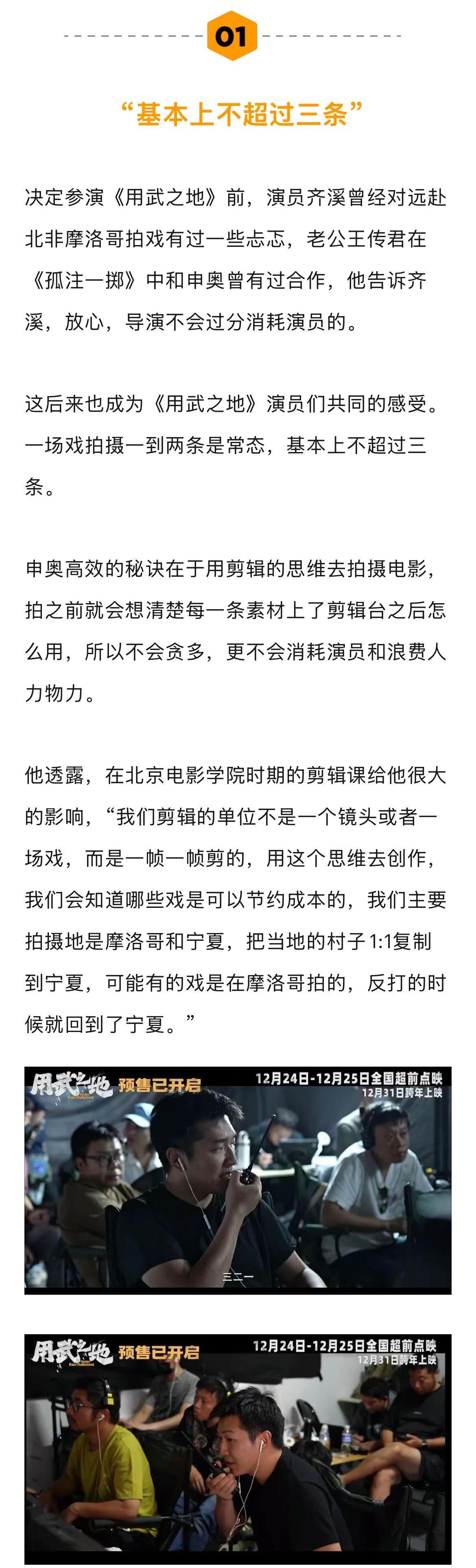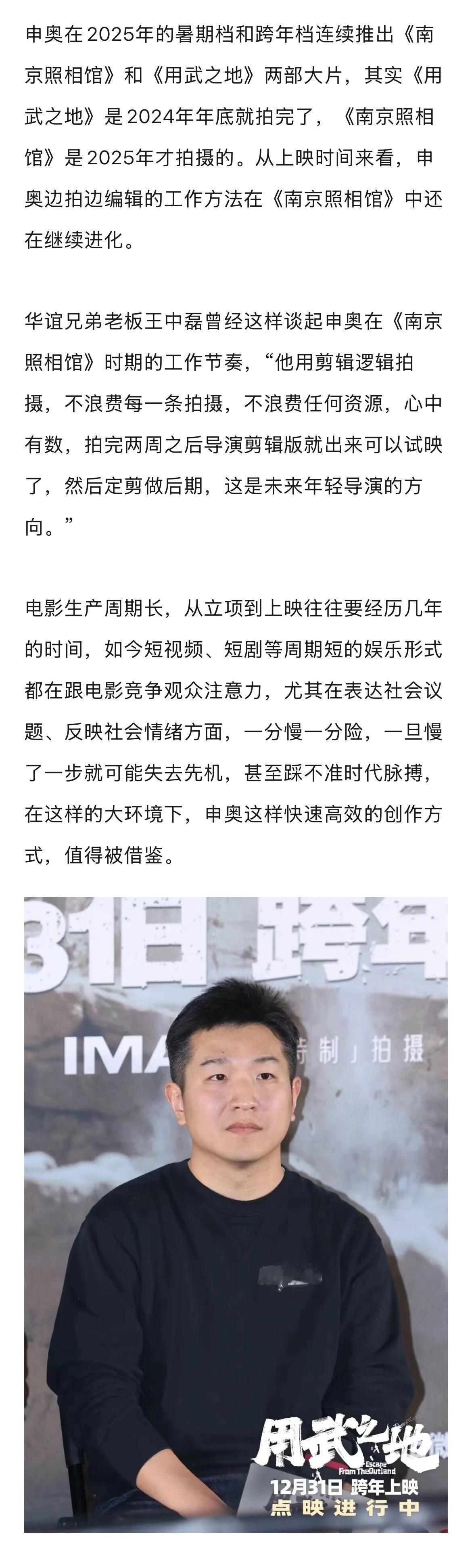 申奥回应高产郑恺谈踩地雷戏 申奥在2025年的暑期档和跨年档连续推出《南京照相馆》和《用武之地》两部大片。据新浪娱乐工作室了解,《用武之地》2024年年底就拍完了,《南京照相馆》是2025年才拍摄的。从上映时间来看,申奥边拍边编辑的工作方法在《南京照相馆》中还在继续进化。《用武之地》中有一场重头戏,时在肖央和齐溪饰演的这对夫妻里二选一,这场戏场面大、调度复杂,还有极强的情感张力,肖央和齐溪透露,申奥在拍摄前已经把分镜头想得非常清楚,演员只需要演好几个关键点、真情流露就可以了,所以那场重头戏其实是一条过的。肖央感慨,申奥是在用胶片时代的剪辑思维来拍片,以前的导演因为胶片太贵,不可能让演员一场戏演好多条,申奥也继承了传统导演的那种惜墨如金的拍摄方式,追求的是每一场戏的精确。在拍摄前做好充足准备,而不用到了现场再一遍遍调试。华谊兄弟老板王中磊曾在【新浪潮论坛】这样谈起申奥在《南京照相馆》时期的工作节奏,“他用剪辑逻辑拍摄,不浪费每一条拍摄,不浪费任何资源,心中有数,拍完两周之后导演剪辑版就出来可以试映了,然后定剪做后期,这是未来年轻导演的方向。”电影生产周期长,从立项到上映往往要经历几年的时间,如今短视频、短剧等周期短的娱乐形式都在跟电影竞争观众注意力,尤其在表达社会议题、反映社会情绪方面,一分慢一分险,一旦慢了一步就可能失去先机,甚至踩不准时代脉搏,在这样的大环境下,申奥这样快速高效的创作方式,值得被借鉴…娱理独家↓