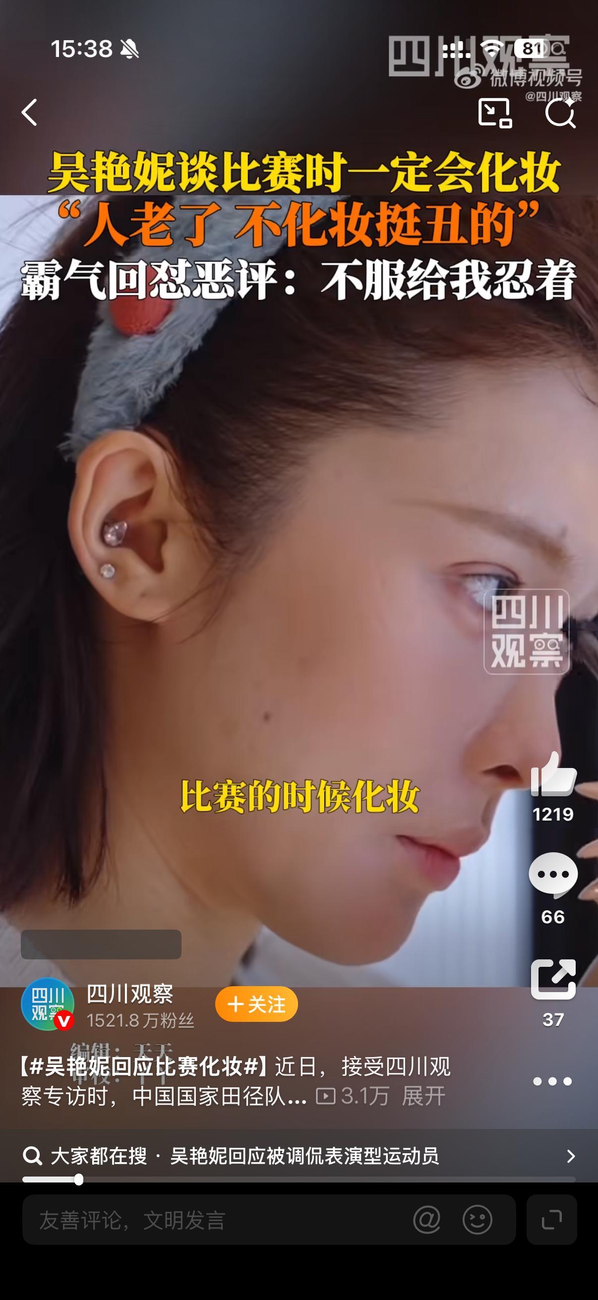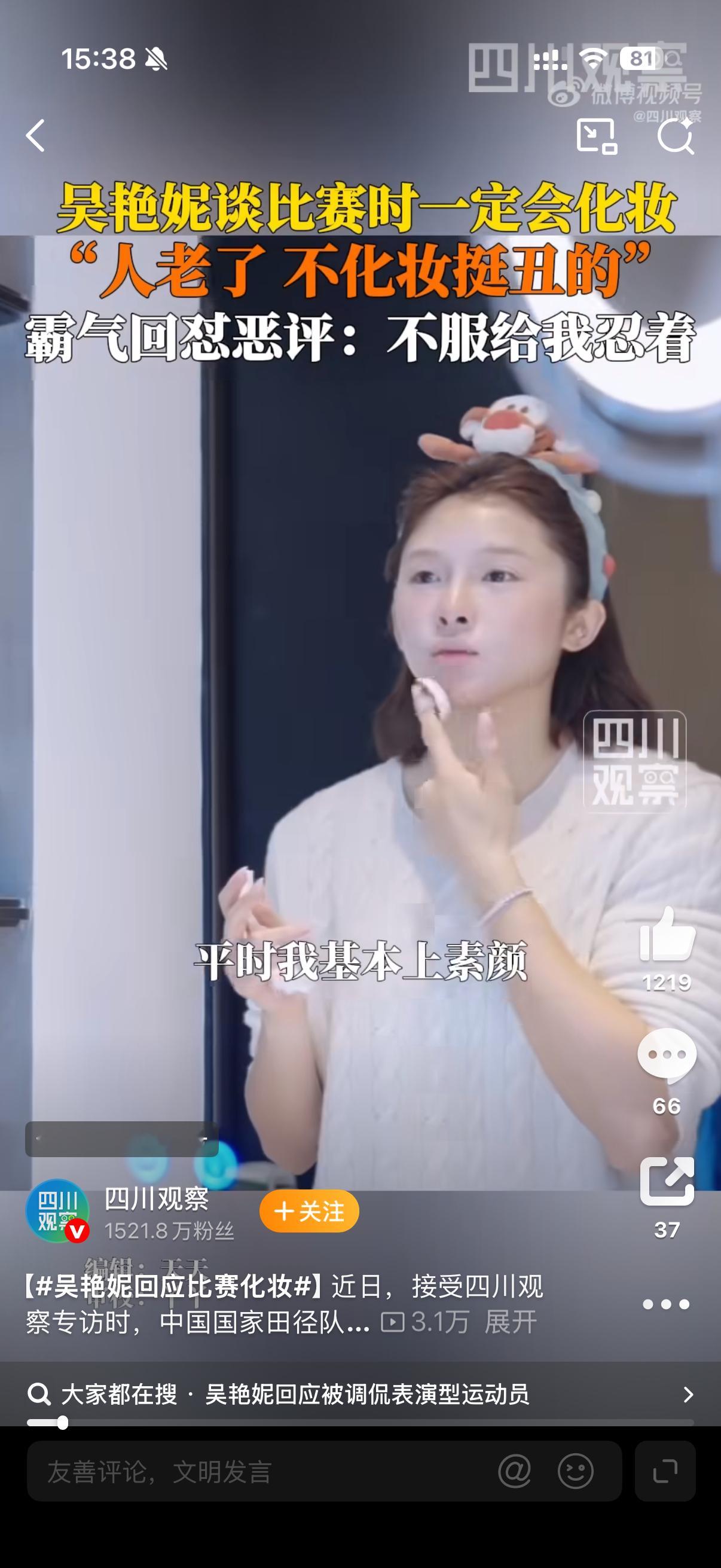 吴艳妮回应比赛化妆我觉得化妆没啥呀!她从事的是竞技体育,比赛成绩好跟化不化妆有什么关系呢? 每个人都有爱美之心呀,爱打扮自己我觉得什么问题都没有,甚至把自己打扮的漂漂亮亮对自己的心情也有好处!没准心情一好成绩更好了!希望吴艳妮以后取得更好的成绩!