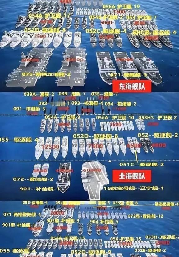 中国三大舰队、也是目前世界上最能打的三支舰队、这就是我们敢和美帝国硬钢的底气、很多人可能不知道我们拥有如此强大的三支舰队仅仅是这十多年间发生的事、2016的南海对峙但凡我们有如今的实力美军航母编队都不敢跑到我们家门口来耀武扬威! 中国海军这几年变化大得让人眼前一亮。2010年左右,主战舰艇还靠少数引进和早期国产型号,航母还没影子,总吨位有限,在亚太地区追赶别人。到现在,舰艇总数超400艘,总吨位超300万吨,新舰占比高得惊人。 三艘航母全部入列,055型万吨驱逐舰批量服役,052D型导弹驱逐舰数量众多,054A型护卫舰护航有力,两栖攻击舰和登陆舰增强投送,核潜艇和常规潜艇齐备,岸基导弹支援强劲。 而且三大舰队各有分工,实力均衡提升,在全球海军中名列前茅。南海舰队负责南部广阔海域,装备最齐全。山东舰和福建舰部署这里,福建舰电磁弹射系统先进,能搭载歼-35隐身机和空警-600预警机。 万吨驱逐舰多艘,052D型十余艘,护卫舰充足,核潜艇包括攻击型和战略型,常规潜艇众多,两栖舰有075型和071型。在南海这片关键区域,火力密度高,局部优势明显。 北海舰队总部青岛,守护北部要冲。辽宁舰常驻这里,携带歼-15机群。万吨驱逐舰和052D型配备齐全,总吨位大,潜艇力量强。在黄海渤海,防御固若金汤,拱卫京津门户。 东海舰队总部宁波,面向东部敏感方向。两栖力量突出,多艘075型领衔,052D型和护卫舰众多,依托陆基航空兵,歼-20隐身机上百架支援。舰艇总吨位高,快速反应能力强。 这些舰队装备高超音速导弹,一艘055型垂发单元112个,火力覆盖远距离。三大舰队协同,岸基东风导弹配合,在近海威慑强大。 说起2016年南海对峙,那是最紧张一刻。美军斯坦尼斯号和里根号双航母,带十余艘舰艇、上百架飞机靠近黄岩岛附近,试图施压。中国海军调动上百艘舰艇,四位将领指挥,新服役052D舰增援,轰-6K巡航,东风导弹警戒。 美军雷达出现多个信号,最终航母编队转向菲律宾东部,只留少数舰艇在外。中国演习结束,美方东撤。那时海军还在成长,辽宁舰训练初期,驱逐舰不多,却展现坚定立场。 如今,三艘航母齐备,福建舰入列南海,万吨驱逐舰和核潜艇群,高超音速武器覆盖,美航母靠近核心区难上加难。
