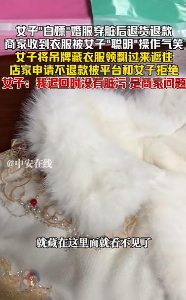 “活不起了!”,近日,安徽,一女子网购了件婚服,婚礼结束后便申请退货退款,商家收到后,发现女子用别针将吊牌藏在了看不见的地方,而且衣服上还有明显污渍,最后商家气不过,申请不退款,结果被平台和女子拒绝。网友:太丢人了!   最近安徽一件网购婚服退货的事儿,让不少网友都忍不住吐槽“太丢人了”,本来结婚是件喜庆事,可这位女子的操作,硬是把好事变成了争议焦点,连商家都被气到忍不住曝光。   事儿的经过其实很清楚,就是一名女子在网上买了件婚服,穿着办完婚礼后,转头就申请了退货退款。   商家这边收到退回的衣服后,一检查就发现了问题,女子为了能顺利退货,特意用别针把吊牌固定在了脖子位置,外面把衣领放下来就能完全挡住,不仔细查根本发现不了。   更明显的是,衣服上还留着明显的污渍,尤其是衣服内侧,脏得很明显,一看就是实实在在穿过后没清理的样子。   商家看到这情况,气不打一处来,要知道商家早就标注了注意事项,明确说不要带妆试穿、吊牌剪掉后不退换,女子这明显是故意钻空子。   于是商家直接申请了不退款,可没想到,这个申请不仅被女子拒绝,连平台都站在了女子那边,支持了她的退货诉求。   说实话,看到这儿可能有人会疑惑,平台为啥会支持这样的退货?毕竟衣服已经实际穿着参加过婚礼,还弄出了污渍,早就影响二次销售了。   说白了,可能还是因为女子没剪吊牌,表面上看似符合“无理由退货”的形式要求,但明眼人都能看出来,这就是故意“白嫖”婚服穿。   从商家的角度想,这事换谁都得气,卖一件婚服本来就赚不了多少,遇上这样的客户,衣服被穿脏用旧,既没法二次销售,退款还得照给,相当于白送一件婚服让人家办婚礼,换哪个小本生意都扛不住这样的损失。   也难怪商家会忍不住把这事曝光出来,实在是咽不下这口气。   再说说这位女子的操作,结婚是人生大事,婚服本该是值得珍藏的纪念,可她却想着穿完就退,为了省这一笔钱,连基本的诚信都不顾了。   用别针藏吊牌的小动作,明显是早有预谋,把心思都用在了钻规则空子上。   可能她觉得这样操作很“聪明”,能省下水钱,却没想到丢了更重要的脸面。   这事曝光到网上后,网友们的看法出奇一致,都觉得这女子的做法太丢人。   有人说,哪怕只穿一次,自己也会好好洗净收藏婚服,这是幸福的见证,根本舍不得这样折腾;也有人吐槽,现在有些人为了省钱,真是毫无底线,把网购平台的无理由退货规则当成了“白嫖工具”。   其实无理由退货规则的初衷,是为了保障消费者的合法权益,避免买到不合适的商品,可像这种故意穿完关键场合再退货的行为,早就超出了合理范畴,本质上是在损害商家的合法利益,破坏正常的交易秩序。   平台在处理这类纠纷时,也该多考量实际情况,不能只看表面的吊牌是否完整,更要核实商品是否真的未被使用、不影响二次销售。   毕竟做生意讲究诚信,消费同样也得讲诚信,为了省一件婚服的钱,就丢掉自己的诚信和脸面,这样的“划算”真的值得吗?   或许这位女子没意识到,一时的小便宜,换来的却是全网的吐槽和负面评价,这样的代价可比一件婚服贵多了。   对此您有什么不同的看法,可以在评论区留言讨论!!!