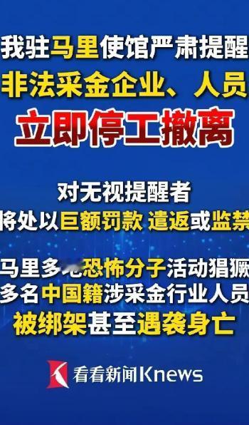 中国大使馆发文。要求中国公民立即撤离!!!看见这个新闻的时候,我还以为是日本那边的。毕竟中日这事已经闹了那么久,真到了不可挽回的地步,也都正常。点开一看是马里的,位置在布谷尼大区。   说实话,看到马里这两个字,很多人可能和我一样,第一时间会反应过来这是非洲的一个国家,但对具体的安全形势没那么了解。   但能让使馆专门发文提醒立即撤离,足以说明当地的情况已经很危急了。   根据权威信息显示,12月23日中国驻马里大使馆发布提醒,12月24日凌晨相关通知就广泛传开,核心就是针对布谷尼大区的中国公民和企业,要求大家尽快撤离。   之所以要这么紧急地发出通知,原因很明确:近期恐怖分子在布谷尼大区频繁袭击中国公民和企业,不仅焚毁生产设备,还绑架了多名人员。   这种直接针对同胞的暴力袭击,无疑让当地的安全形势变得十分严峻,风险已经高到必须立即转移的程度。   使馆还特别强调了两点,一是务必合法经营,因为马政府没办法对非法经营的中国公民和企业提供安全保护;二是近期别再往布谷尼大区去,已经在当地且没得到马方安全保护的,必须尽快撤离到安全地区。   其实这不是使馆第一次对马里的危险地区发出撤离提醒了,早在12月初,使馆就已经发文警示过,今年下半年以来,马里首都巴马科以外的地区恐怖分子活动就很猖獗,专门盯着外国企业和人员搞袭击、绑架,已经造成了严重后果。   尤其是那些非法采金的矿区,安防措施特别薄弱,遇到袭击根本没能力防护。   之前肯涅巴、布谷尼这些非法采金人员聚集的地方,就已经发生过恐袭事件,有中国同胞被绑架,甚至还有人遇袭身亡,给家里人带来了没法弥补的伤痛。   这么说吧,使馆多次提醒后,不少同胞已经听从建议撤离了,成功避开了危险,但还是有一部分人抱着侥幸心理,要么拒不撤离,要么撤了之后又回去,执意在这些高风险地区搞非法采金。   这次使馆再次严肃提醒,也明确说了后果,要是无视提醒继续非法采金,设备可能被扣押、还要罚巨额罚款,人员可能被遣返甚至监禁,马里和国内相关部门还会对造成恶劣后果的人员和企业负责人严肃追责。   能让使馆凌晨发文反复强调,说明布谷尼大区的安全形势已经到了非常危急的地步,恐怖分子的袭击可能还会持续升级。   对于还在当地的同胞来说,现在最该做的就是放下侥幸,赶紧按照使馆的提醒撤离,毕竟生命安全才是第一位的。   而对于我们这些在国内的人来说,看到这样的通知,除了替当地同胞捏把汗,也更能感受到国家对海外公民安全的重视。   另外也得提醒一句,要是有家人朋友在马里,一定要及时联系确认他们的情况,让他们务必关注使馆的通知,遇到紧急情况赶紧报警,或者拨打驻马里使馆的领事保护电话+223-78110040,也可以打外交部的12308应急呼叫中心电话。   海外出行或者工作,安全永远是底线,千万不能为了一点利益就拿生命去冒险。   以上都是个人观点,对此您有什么不同的看法,可以在评论区留言讨论!!!