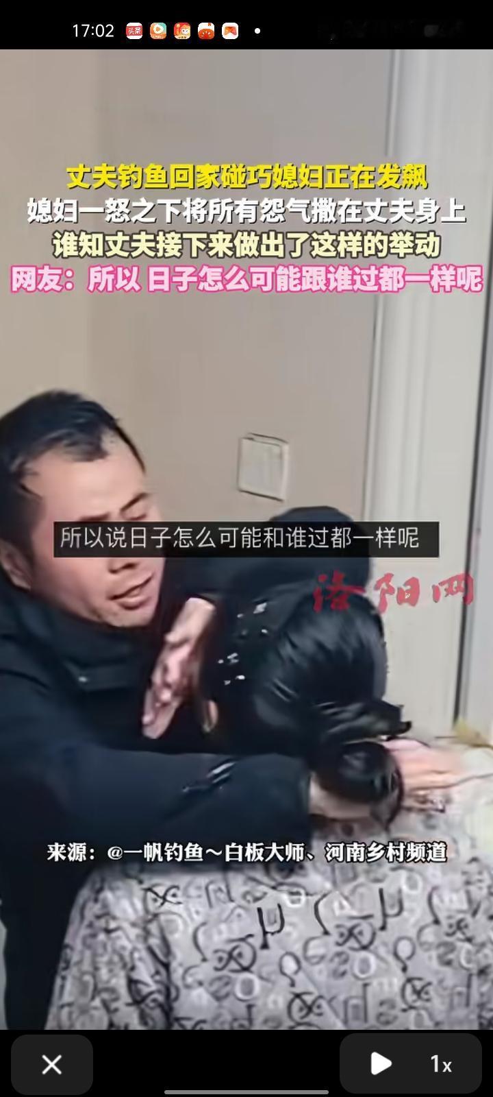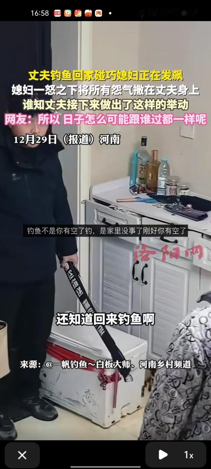 12月24日,周口市西华县。丈夫钓鱼回家碰巧妻子给孩子辅导作业,妻子一怒之下当着孩子的面,拿着桶泼往丈夫脸上,此时的丈夫内心充满无奈,妻子骂着骂着就哭了。见状,丈夫走到妻子前面安慰。那桶水,泼掉的是积压已久的埋怨,这一拥抱,约定了未来的陪伴,别让鱼竿超过了陪伴家人的时光