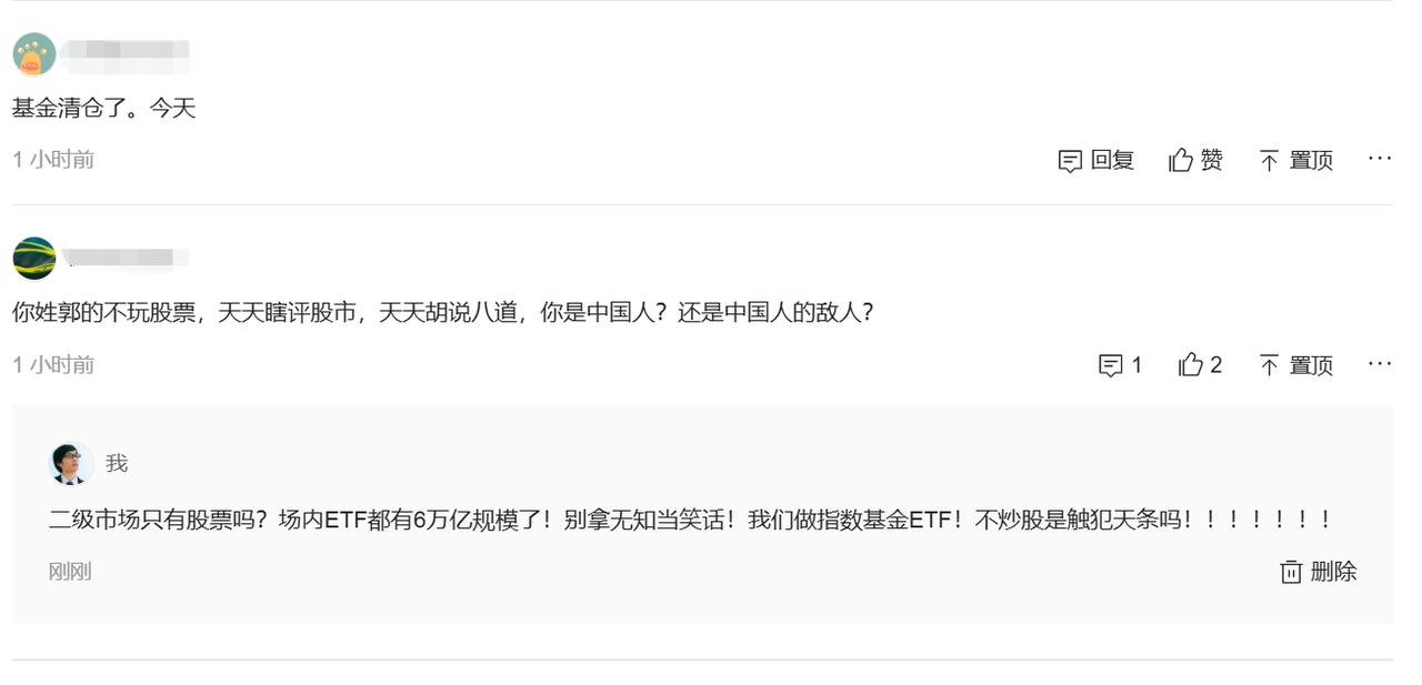 一句话必须吐槽!每天面对2亿股民,我真的好心累…… 二级市场除了股票就没有其他工具了吗?不要以为现在还是90年代!场内目前有ETF、QDII、LOF、REIFS等基金,同时也有可转债,还有ETF衍生品,连期权都快凑齐,只差A500的期权了吧…… 一群新手,把无知当认知!毕竟除了新手也没有什么人喜欢看别人的观点。不过,小凡每天与2亿股民聊指数产品,确实是鸡同鸭讲。 其实,不用那么复杂的,你只需要知道我不玩股票就行了。小凡的个人签名,以及置顶的微头条解释的不够清楚吗? 上周,场内的ETF规模已经破6万亿了,汇金、险资、外资、机构都是重仓的指数产品,包括私募基金今年发行的几乎都是指数产品的量化,以中证1000指增为主…… 小凡做指数投资,每天预判指数的涨跌,我害了哪个股民!我跟股民无话可讲,现实里面大家炒股票的人,与炒基金的也聊不到一起,其实我们与场外的基民也聊不到一起,我们炒股指!