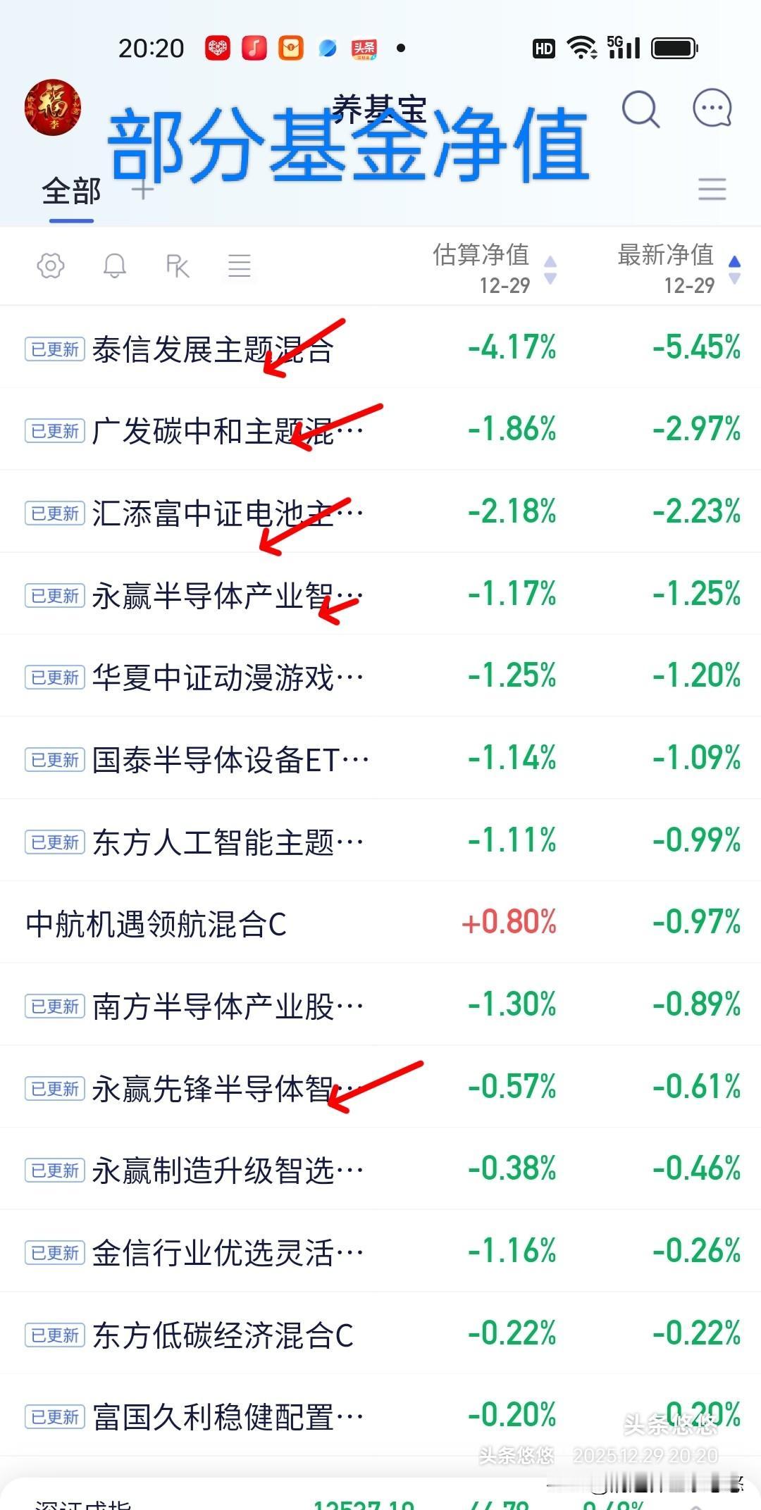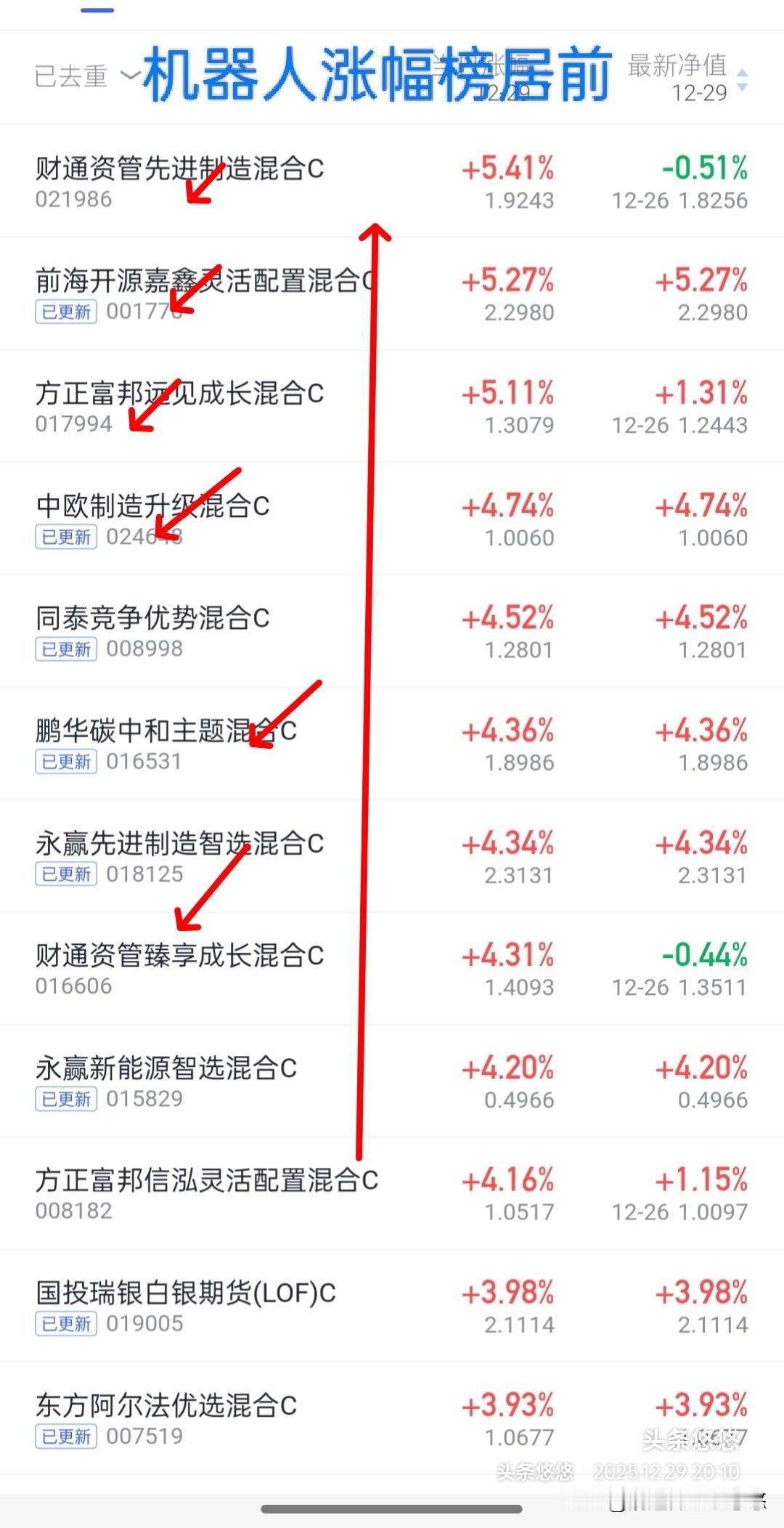 29日基金净值出炉,永赢机器人有惊喜。下图一二是部分基金净值,永赢机器人大涨4.34%,永赢先锋下跌0.6%,电池跌幅较大。 图三是今日基金持有榜,永赢机器人再次夺冠,中航机遇领航位居第二,永赢先锋半导体退居第六名。 图四是今日基金涨幅榜,机器人夺冠。 今天下跌比较大的板块就是锂电池,其次是有色金属板块。 年底两天,分歧加大,波动加大,有想减仓了结的,也有想进入赌跨年度行情的,我也想节前降低仓位,看最后两天行情如何?大涨大减仓,小涨小减,不涨不减。