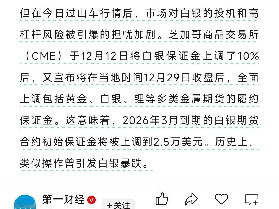 芝加哥交易所再次提高保证金,12月12日曾增加保证金,当日白银大跳水,之前上交所也曾提高交易保证金和手续费,上次白银跳水后回升,这次有点困难,马上元旦放假,节假日不确定性高,资金多半获利了结。提高保证金限制了流动性,很多资金卖出时没有足够接盘的,而1月8号后还有基金要一周内卖出,抛压不小。短期震荡下行可能性极大。
