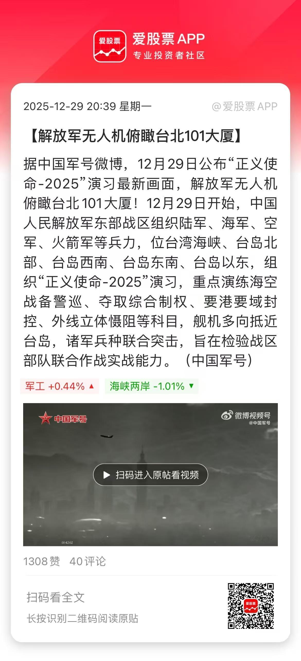 今晚最激动人心的,解放军无人机俯瞰台北101大厦,这个画面不光上了新闻联播,还上了热搜第一! 这意味着,这次军演过后,台湾岛已无任何屏障。台湾省的有些人今夜无眠了。 另外,东部战区发布微视频《这么近那么美 随时到台北》,看着挺热血沸腾的。爱股君想起一句话,这么近那么美,周末想去台北,我们一定会等到那一天的。 这个事儿对军工(商业航天),福建板块又带来催化。从情绪上,跟湾湾相关的题材,确实人气是独一档的。