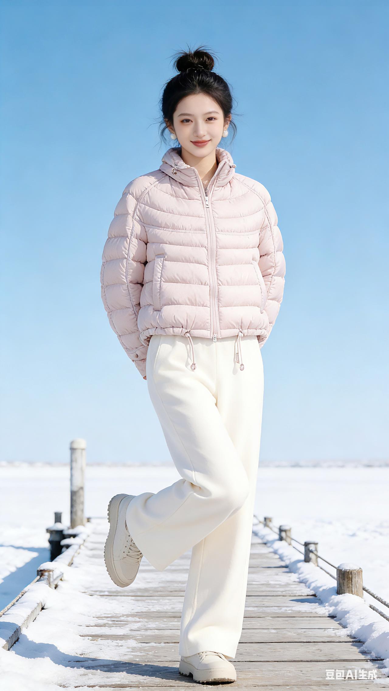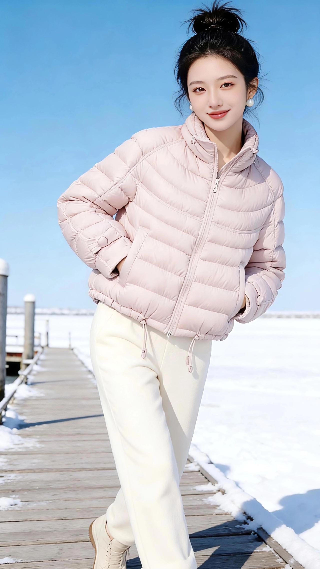 粉袄映雪 浅粉色的轻薄羽绒服,像揉了一团冬日的软云,松松软软地裹在身上,竖纹的菱格将寒气隔绝在外,只留一抹温柔的粉,在皑皑白雪里漾开暖意。米白色的阔腿裤垂坠着,裤脚轻轻扫过覆雪的木栈道,与浅粉的袄子衬出柔和的层次感,脚下的浅色鞋子踩在雪融的木板上,敲出细碎的声响。 她站在雪后的码头,天是洗练过的湛蓝色,没有一丝云絮。丸子头高高束起,碎发被海风拂得轻轻飘,抬手拢了拢发梢时,指尖触到羽绒服的拉链,金属的冷意与面料的软暖撞出奇妙的反差。她笑着迈步,一手插在袄子口袋里,步子轻快得像踩着云朵,木栈道的积雪在脚下微微发响,远处的海面结着薄冰,却因她的身影,添了几分鲜活的甜。 再站定时,她背着手轻轻踮起脚,粉袄的下摆微微扬起,像振翅的蝶。阳光落在她的肩头,将粉色的面料染得更柔,雪光映着她的笑眼,这一刻,冬日的清寒都被这抹温柔的粉,揉成了绕指的软。 高级感穿搭 冬季穿搭 棉衣棉服 羽绒服