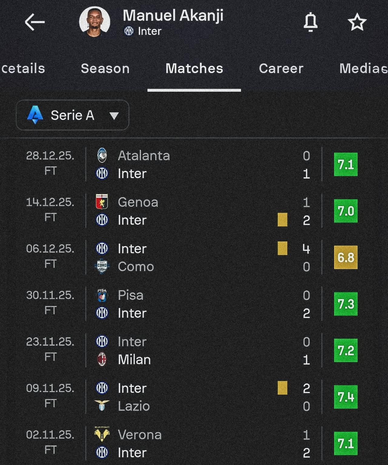国际米兰这200万花的太值了!国际米兰近8场意甲联赛主力中卫阿坎吉场均评分7.23分,本赛季从曼城租借(200万租借费+1500万有条件买断)加盟之后迅速成为了国际米兰防线最稳定的球员,瑞士国脚的比赛气质和自身实力都没得挑,国际米兰从管理层到主教练再到球迷对阿坎吉都非常喜欢,马洛塔赛季末肯定会进行买断,这甚至有可能是国际米兰历史上花的最超值的200万欧元。 #国际米兰# #意甲# #国米#