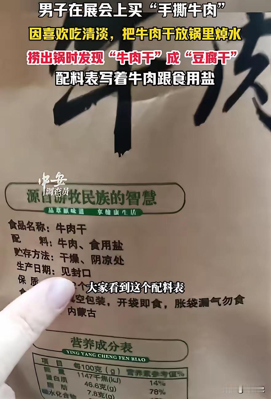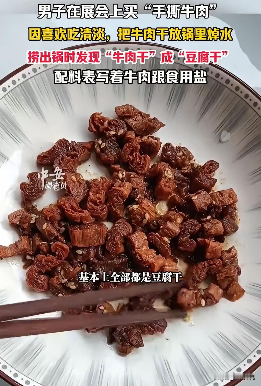 “必须严惩!”湖南,男子去展会逛街时,以75元一斤的价格买了点牛肉干回家,本来看配料表干干净净只有牛肉,结果偶然放水中煮了一下,却发现牛肉干变成了豆腐干,男子直呼太离谱。网友:配料表也敢造假? 湖南这名男子,逛展会时撞见个牛肉干摊位,包装朴素,配料表更是干净得只剩牛肉和食盐,标价75元一斤。 他心里盘算着,这般实打实的配料,价格也不算贵,索性称了些,想着带回家给家人尝尝鲜。 家里口味素来清淡,吃这类干货前,总爱用清水煮上片刻。谁料这一煮,直接煮出了离谱的真相。 原本纹理紧实的牛肉干,遇水后慢慢散开、软烂变形,煮到最后,碗里哪里还有一点牛肉的模样,分明就是一锅软烂的豆制品,半点牛肉的纤维感都没了。 男子又气又无奈,直言这事儿荒唐透顶,随手拍下视频提醒旁人,买的牛肉干不妨煮煮看,指不定就撞上这般糟心的“惊喜”。 有内蒙的网友一语道破关键:这价格本就透着不对劲,正经牛肉干十斤鲜牛肉出不了两斤成品,当地最平价的都要120元一斤起步,75元,根本买不来纯牛肉干。 这世上最经不起细算的,就是这类明摆着的骗局。牛肉干的成本摆在那里,低价还标榜纯牛肉,本就是自相矛盾的事。 让人膈应的从不是豆制品,豆制品本无罪。真正寒心的,是商家把消费者的信任踩在脚下。 配料表是买卖之间最基本的诚信底线,白纸黑字写着纯牛肉,背地里却是挂羊头卖狗肉的勾当。 倘若商家坦荡标注是牛肉风味豆制品,平价售卖,旁人倒也能坦然接受。 最怕的,就是这种揣着明白装糊涂的造假,骗了钱,更凉了人心,这般行径,真的该好好管管,绝不能姑息!