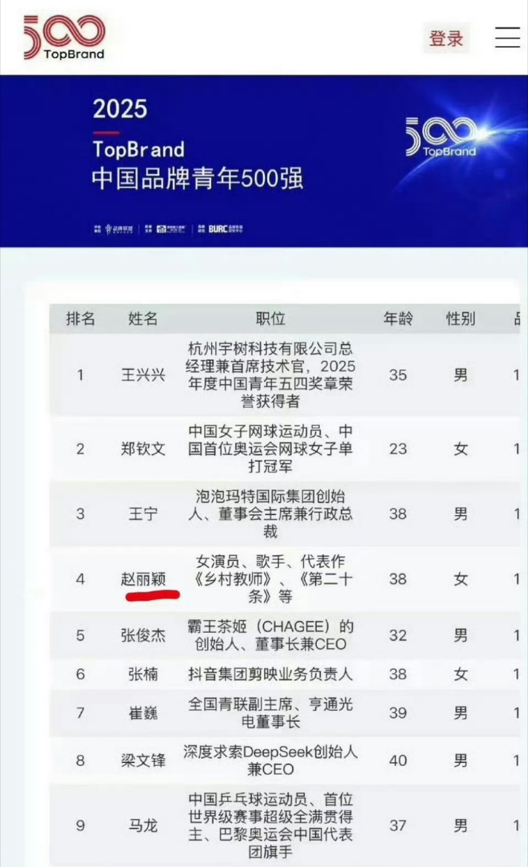 赵丽颖赵丽颖入选中国品牌人物500强 恭喜赵丽颖入选中国品牌人物500强🎉🎉🎉,之前的中国品牌青年位列第四名,现在品牌人物又入选了,好牛!!!赵丽颖入选2025中国品牌人物500强