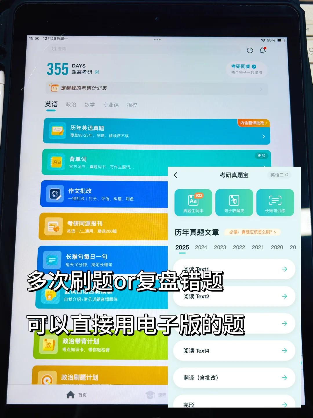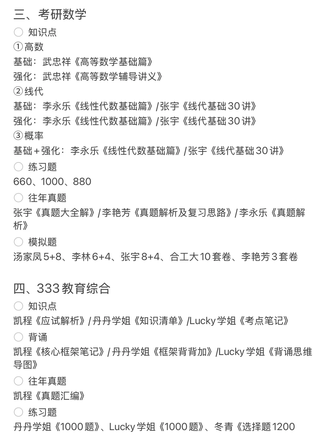 知识点(高数、线代、概率)、练习题、往年真题、模拟题
