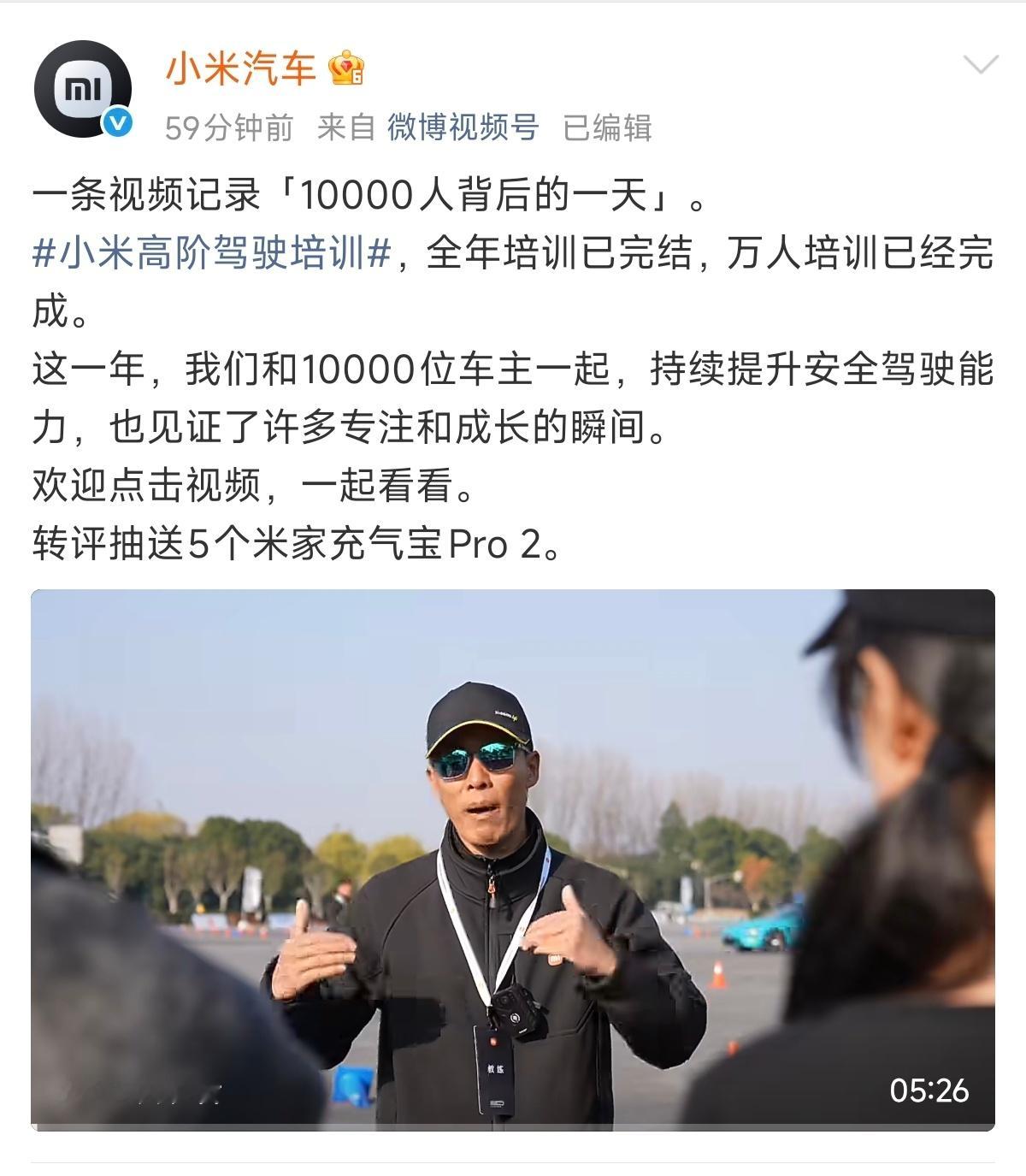 小米高阶驾驶培训1万人目标达成小米高阶驾驶培训1万人目标顺利达成!2025已近尾声,本年度的小米高阶驾驶培训也顺利完结。自6月项目启动以来,小米汽车已组织并落地超400场培训,并顺利达成了「1万人目标」,在“车主服务”与“安全培训”方面投入可以说是有目共睹了。其实小米高阶驾驶培训启动的初衷就是强化「驾驶安全宣传」,通过完全免费的培训课程与活动引导车主“由理论走向实操”,将主动安全与被动安全意识时刻铭记在心,让驾驶真正成为“乐趣”而非“祸患”。这是小米汽车对车主负责任的表现,更是作为新能源车企“社会责任”的具象化表达——“敬畏速度,安全用车”,这是每一家车企都应向车主传达的理念。这一年小米汽车在「卷服务」和「卷安全」方面确实下足了狠心,也收获了相当多车主的认可。期待2026年,小米汽车能持续赢得用户口碑,真正站稳用车安全第一梯队~