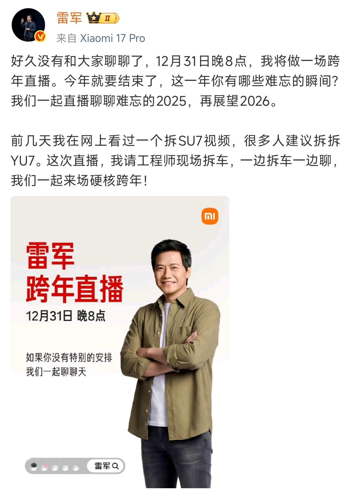 好久不见雷总直播,真是好久不见了....明天晚8点,雷军跨年直播拆车,雷总以直播拆车的形式回应部分网络节奏,到时候见。