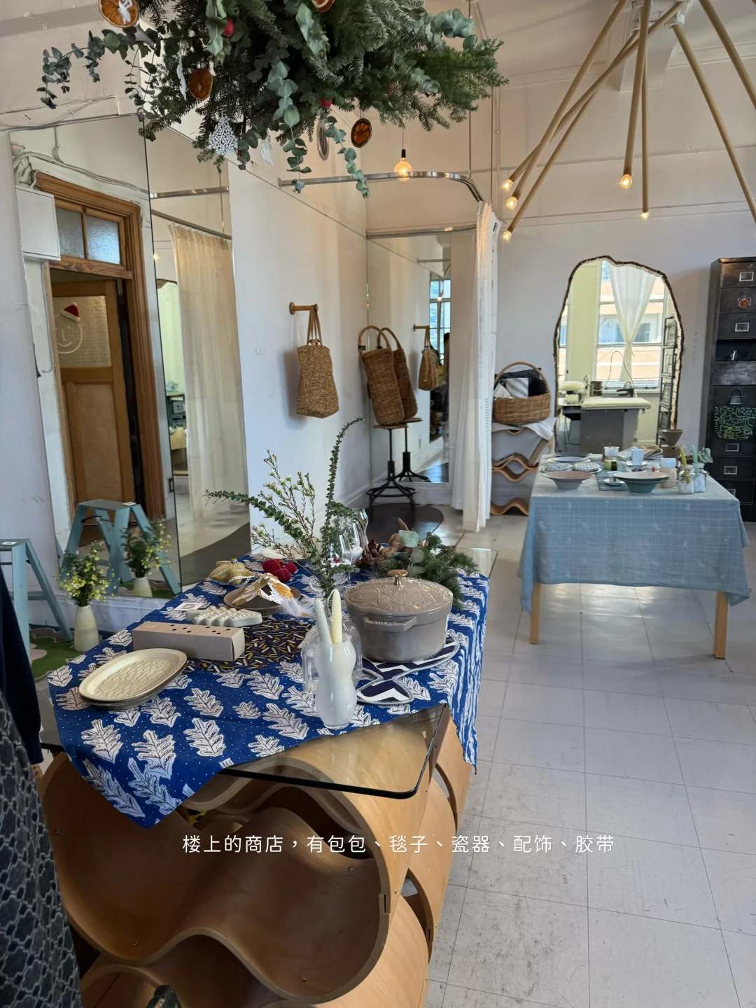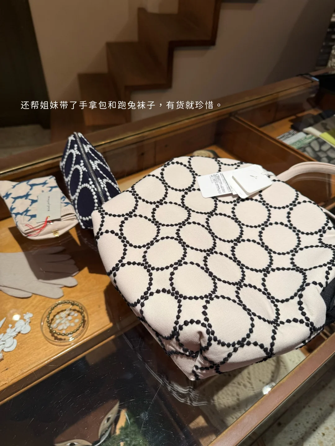 总共五层,需要爬楼。我当时去的时候能买的就是一楼(成衣、袜、配饰、包包)和四楼(包包、毯子、瓷器、配饰、胶带)楼上还有个书店。红色铃鼓的毯子有货,可惜行李箱塞不下了(现在很后悔😕 入了盘子、胶带,胸针款式也蛮多,入了一款一眼看上的。我去的时候一楼的包包款式很少,但有一款大号铃鼓麦芬包,白色和深色都有,白的上身太美了,果断入。帮姐妹带了手拿包和跑兔袜子,有货就珍惜。
