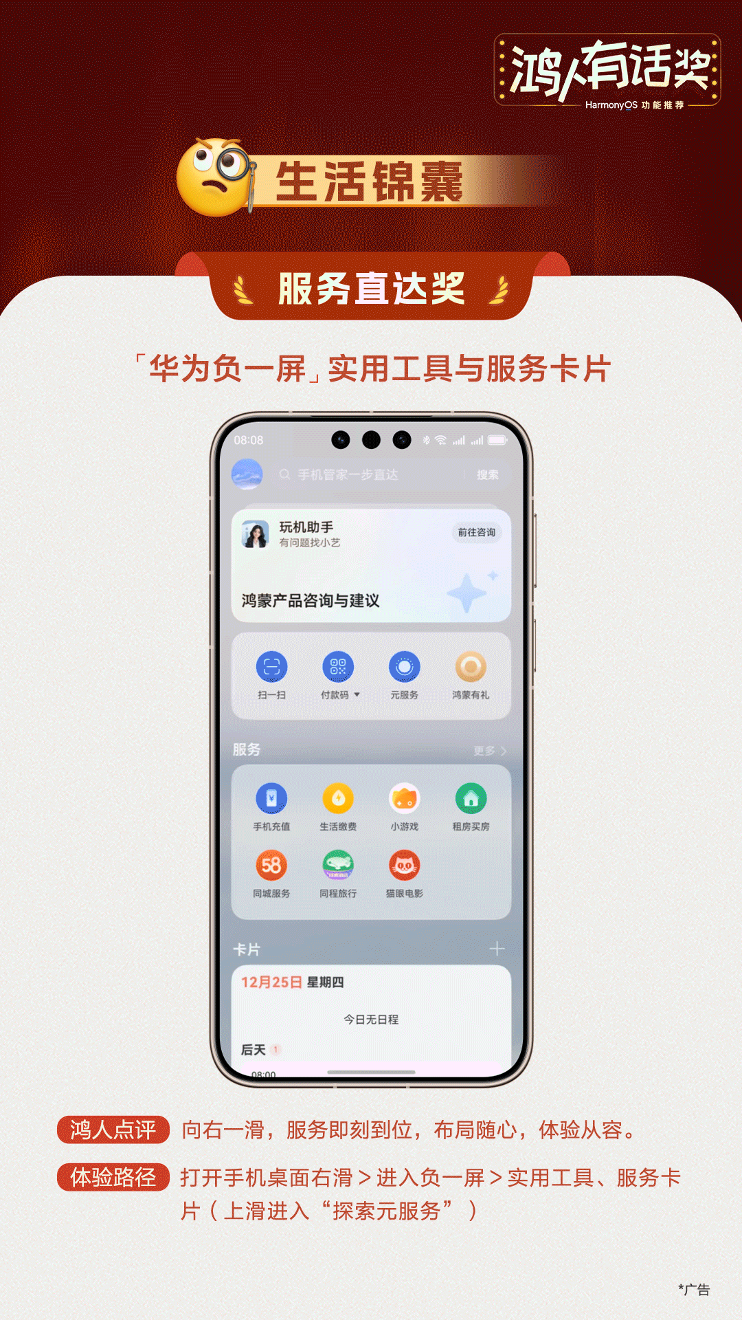 今天HarmonyOS6功能推荐重磅发布,鸿蒙6发展到今天,其实开发出了非常多有想象力的功能,并且是鸿蒙绝无仅有的。比如AI防窥保护,识别到有陌生人在偷看你的手机屏幕,系统会自己弹窗提醒。还有语音控制小艺修图,说出你的要求即可。隔空抓取图片,抓取红包,这些高效率且有意思的交互都是鸿蒙6以后才出现的。建议你们都体验一下鸿蒙6,和以往的系统完全不一样。现在长按华为手机电源键唤醒小艺,说“鸿人有话奖”,还有惊喜可领用了就回不去的手机功能