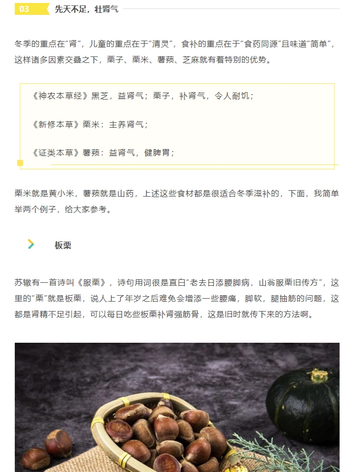 《神农本草经》黑芝,益肾气;栗子,补肾气,令人耐饥;