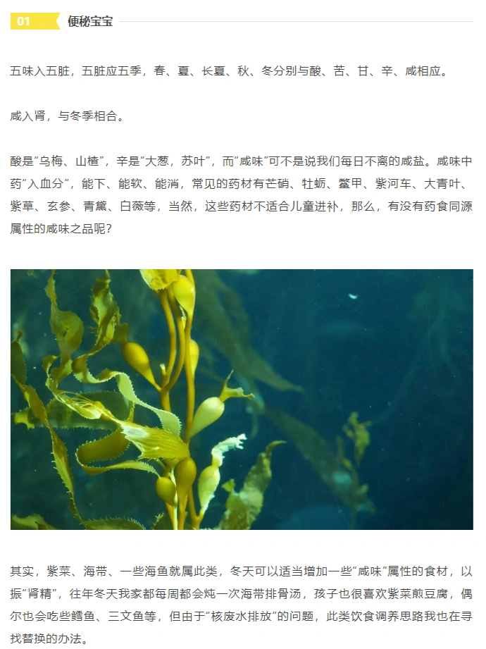 紫菜、海带、一些海鱼就属此类,冬天可以适当增加一些“咸味”属性的食材,以振“肾精”,往年冬天我家都每周都会炖一次海带排骨汤,孩子也很喜欢紫菜煎豆腐,偶尔也会吃些鳕鱼、三文鱼等。