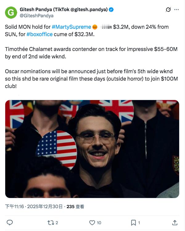 TNABO 《至尊马蒂》工作日表现强劲,预计这周结束就能达到五六千万美元北美票房,A24历史首部本土破亿势不可挡。提莫西·查拉梅从《旺卡》、《摇滚诗人:未知的传奇》到目前已经连续三年成为圣诞档的宠儿,明年还有《沙丘III》在12月18日公映