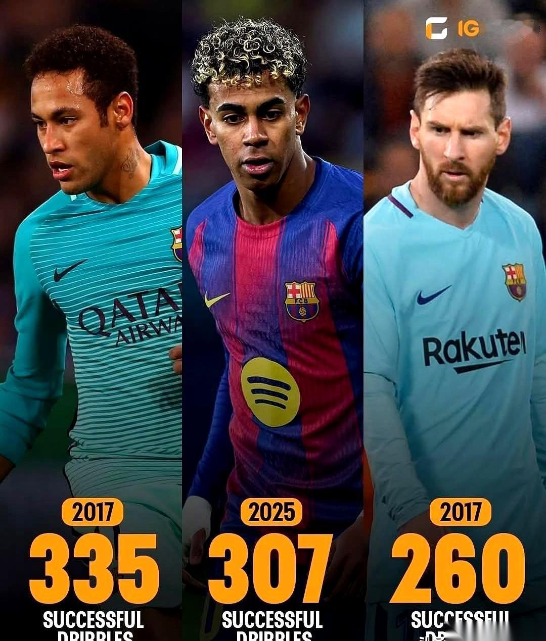 我跟你说,我看到一个数据,直接给我干懵了。 一个16岁的小孩,亚马尔。 在一个自然年里,成功过人超过300次。 你猜上一个做到这件事的人是谁?内马尔。 那个在球场上随心所欲,把防守当木桩耍的巴西人。 这什么概念? 就是这小子拿球,眼里只有一个字:干。 防守队员在他面前,可能就跟咱们上班路上遇到的减速带差不多,颠一下,就过去了。 最扎心的是什么你知道吗? 就连那个男人,梅西,在他最无所不能的年份,这项数据也“只有”260次。 我不是说梅西不行啊,你别杠,梅西是神。 但这个对比,就是赤裸裸地告诉你:时代那趟列车,在你没注意的时候,又往前开了一站。 我们总念叨着青春,总觉得梅罗还能再踢好多年。 但数据不会说谎。 江山代有才人出,这话真不是说着玩的。 别急着捧杀,也别吹过头。 就安安静静地看着吧,看着一个可能属于未来的故事,刚刚写下第一行。 有点恍惚,又有点期待。
