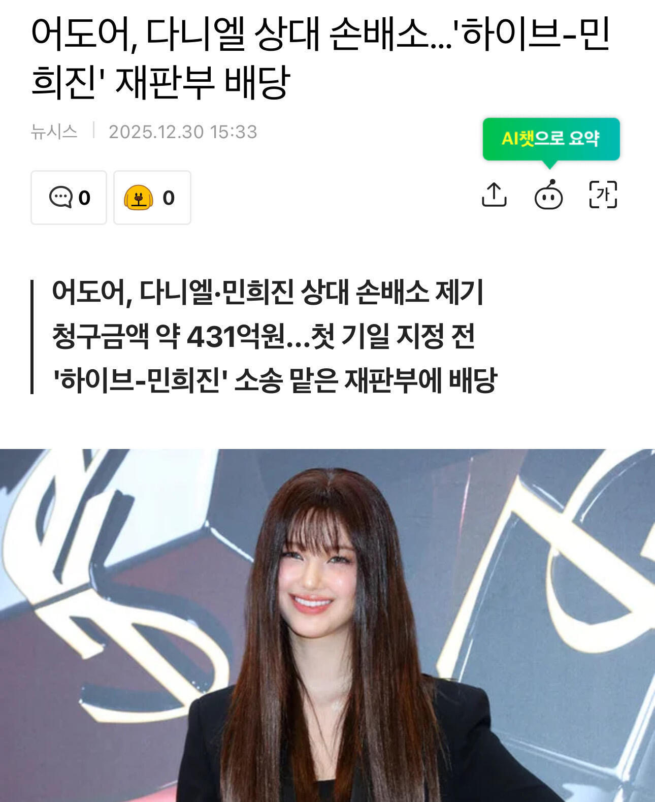 ADOR向Danielle 等人索赔431亿韩元据法律界30日消息,ADOR针对 Danielle 及其家人、以及闵熙珍提起的违约金及损害赔偿索赔诉讼,已分配至首尔中央地方法院民事合议第31庭。ADOR向Danielle 等人索赔约431亿韩元的损害赔偿,目前该案的首次开庭日期尚未确定。