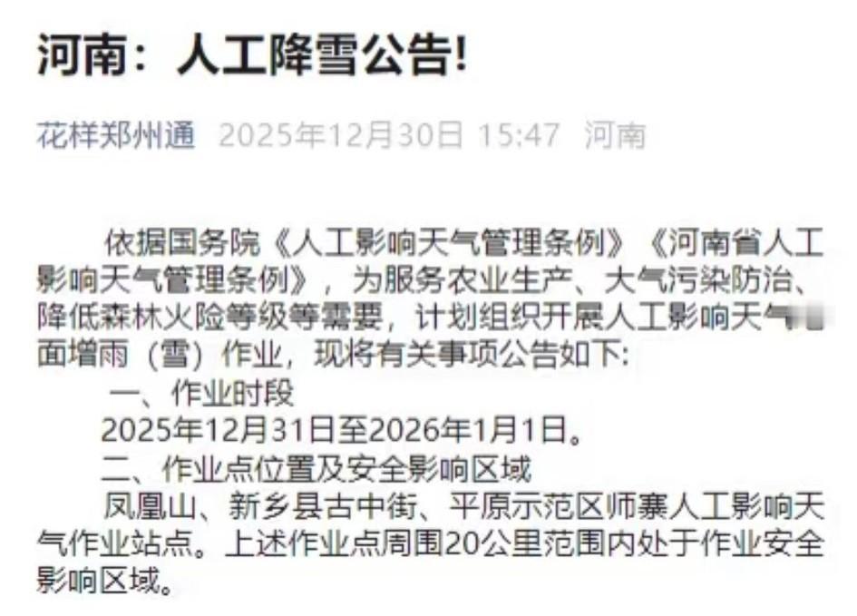 河南12月31日-1月1日要开展人工降雪了。人工降雨经常听说,人工降雪确实难得听到。 前些年网上有传某个地方开展了人工降雪,最后雪却下到了其他地方,也不知道是真是假? 人工降雨也好,增雪也罢,更多是为了农业生产、大气污染防治等方面考虑。可如此过多的干预自然气候的变化,到底是好事还是坏事,又有几个人能真正说明白呢!