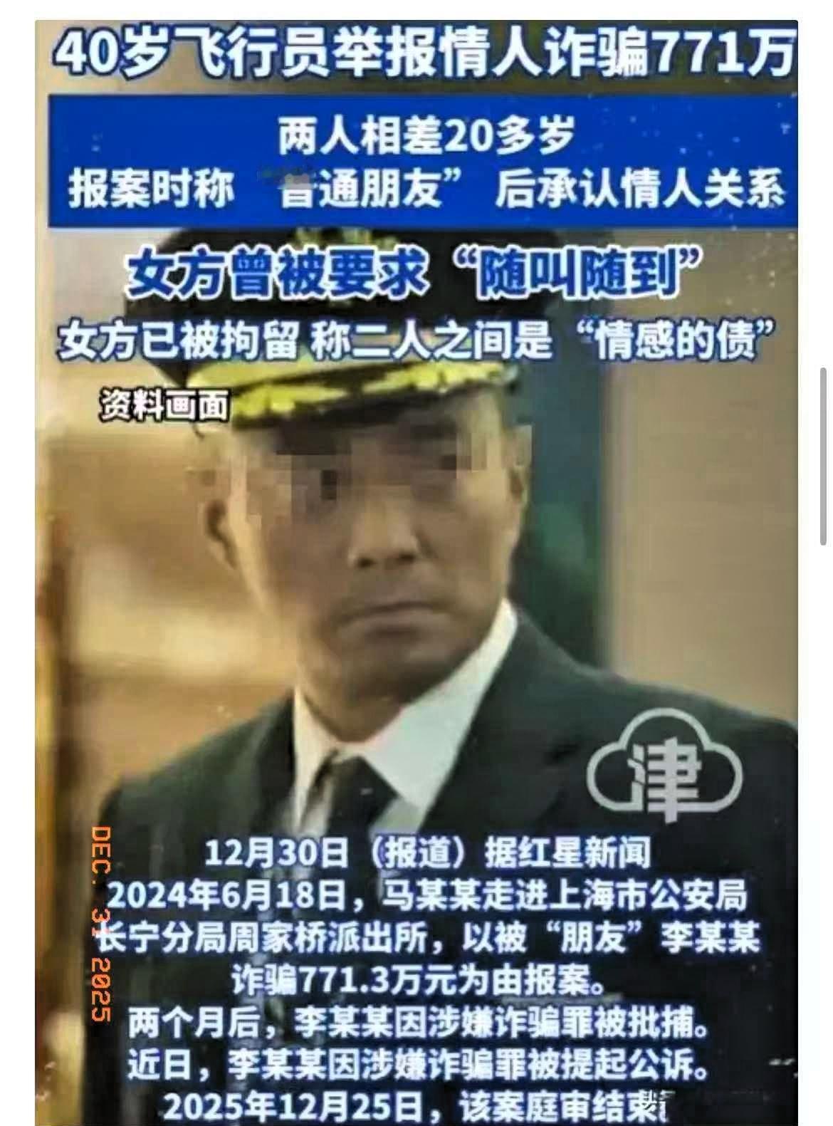 上海,40岁飞行员马某,结识了18岁女大学生李某,二人发展成不正当男女关系 五年间,马某为李某租公寓、买轿车,累计转款超700万元。李某毕业后到上海工作,两人转为同城相处,马某提出要求:只要他在上海备勤,李某就要到航司合作酒店陪伴过夜。即便李某有过一段短暂婚姻,两人的关系也并未中断。 2023年4月,两人关系恶化,马某开始催债,李某写下借条后又反驳款项性质,马某曾因案由错误撤诉,后再次提起民事诉讼,同时向公安机关报案称被李某诈骗771.3万元,案件转入刑事侦查流程。 李某则辩称,这些钱都是马某自愿支付的“包养费”,并非借款。案件指控金额多次调整,经过三次庭审,法院目前尚未宣判。 其实这事的核心,从来不是一张借条能定夺的。当初心甘情愿的付出,是建立在不正当关系的基础上,闹僵后就急于定性为诈骗,未免太没担当。 感情一旦和金钱深度捆绑,到最后撕破脸的时候,就只剩下算计和难堪。法律会给出公正的判决,但成年人该明白,靠钱维系的关系,从根上就长不出体面的结局。
