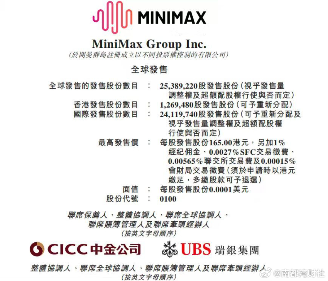 #大模型独角兽MiniMax今起招股#【又一家大模型公司启动招股,阿里等基石投资者下注27亿港元】#大模型独角兽员工平均年龄29岁# 紧随智谱,另一家大模型独角兽IPO全面落地。12月31日,MiniMax(0100.HK)正式启动招股。根据招股书,MiniMax本次IPO拟发行25,389,220股,定价区间为151至165港元/股,在不考虑发售量调整权及超额配股权行使的情况下,发行估值将介于461.23亿港元至503.99亿港元之间,预计将于明年1月9日正式登陆港交所。 值得注意的是,MiniMax此次引入了包括Aspex、Eastspring、Mirae Asset、阿里巴巴及易方达在内的14家基石投资者,认购总额约27.23亿港元。投资者类型横跨国际长线、头部科技、中资长线及产业战略等多个维度。MiniMax则由闫俊杰创立于2022年初,这家员工平均年龄为29岁的年轻公司,在上市前已获得米哈游、阿里、腾讯、小红书、高瓴、IDG、红杉、经纬、明势、中国人寿等多家顶尖机构的投资和支持,是目前成长最快、估值最高的AI科技公司。MiniMax成立于2022年初,是一家“生而全球化”的AI公司,也是少数自成立起,即专注全模态模型研发的大模型公司之一。MiniMax技术迭代密集,已接连在语音、视频与文本等模型取得突破性进展。此前招股书显示,营收方面,招股书显示,2022年、2023年、2024年,MiniMax的营收分别为0、346万美元、3052万美元,截至2025年9月30日收入为5343.7万美元(约合3.76亿元人民币)。值得关注的是,2025年前九个月营收同比增长超过170%,其中海外市场收入占比超70%。截至2025年9月,MiniMax已有超过200个国家及地区的逾2.12亿名个人用户。另外,招股书显示,MiniMax于2022年、2023年、2024年以及截至2024年及2025年9月30日的经调整亏损分别是1215万美元、8907万美元、2.44亿美元、1.7亿美元及1.86亿美元。招股书称,这是由于在大模型研究与开发及AI基础设施方面的重大初始投资以及金融负债公允价值亏损。不过应该关注到,“重仓”投入算力和基础设施,是所有科技公司的现状。事实上从成立起至今年9月,MiniMax累计花费5亿美金,仅用了OpenAI约1%的费用即达成了全模态全球领先的成绩。据悉,MiniMax本次上市拟将募集资金主要用于未来五年的大模型升级与 AI 原生产品开发,为世界提供越来越先进、通用的智能,帮助整个社会提升生产效率、提高发展质量与长期创造力。12月30日,智谱开启港股招股,并计划于2026年1月8日在港交所主板挂牌上市,智谱IPO拟发行3741.95万H股,按每股116.20港元发行价计算,智谱募资规模预计将达43亿港元,本次IPO市值预计超511亿港元。(南都N视频记者 林文琪)
