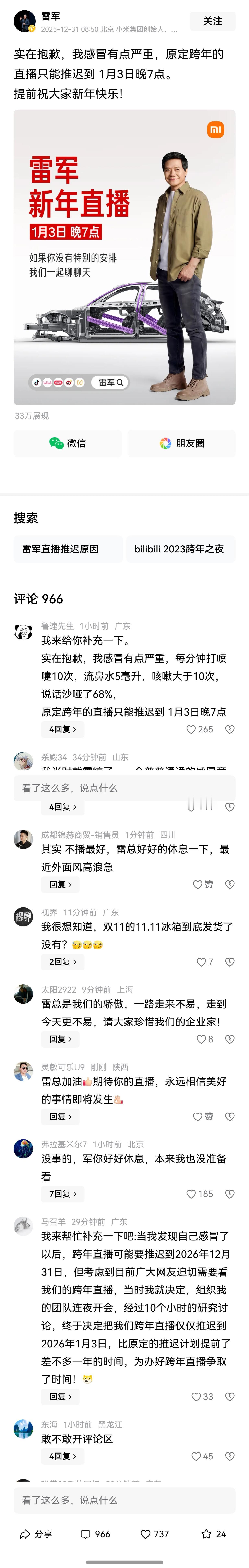 雷军因重感冒推迟了拆车的直播,评论区真的让我笑喷了。 昨天,雷军宣布要在今天晚上做跨年拆车直播,但由于感冒,推迟到了1月3日,不过有才的网友们又开始模仿雷总的口吻,发挥自己的段子才能了,评论区里那真的是热闹非凡。 不过调侃归调侃,不要恶意攻击就好!