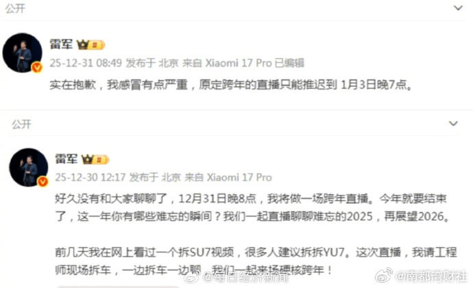 【#雷军就跨年直播推迟道歉#】12月31日,小米创办人、董事长兼CEO雷军发文:实在抱歉,我感冒有点严重,原定跨年的直播只能推迟到1月3日晚7点。12月30日午间,雷军宣布,将于12月31日晚8点做一场跨年直播。雷军在其个人微博表示,“前几天我在网上看过一个拆SU7视频,很多人建议拆拆YU7。这次直播,我请工程师现场拆车,一边拆车一边聊。”(每经综合)