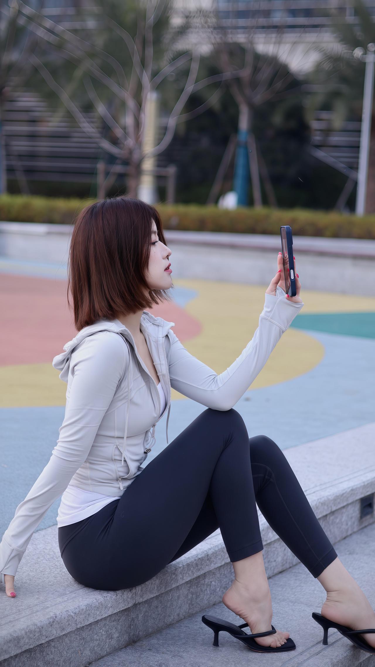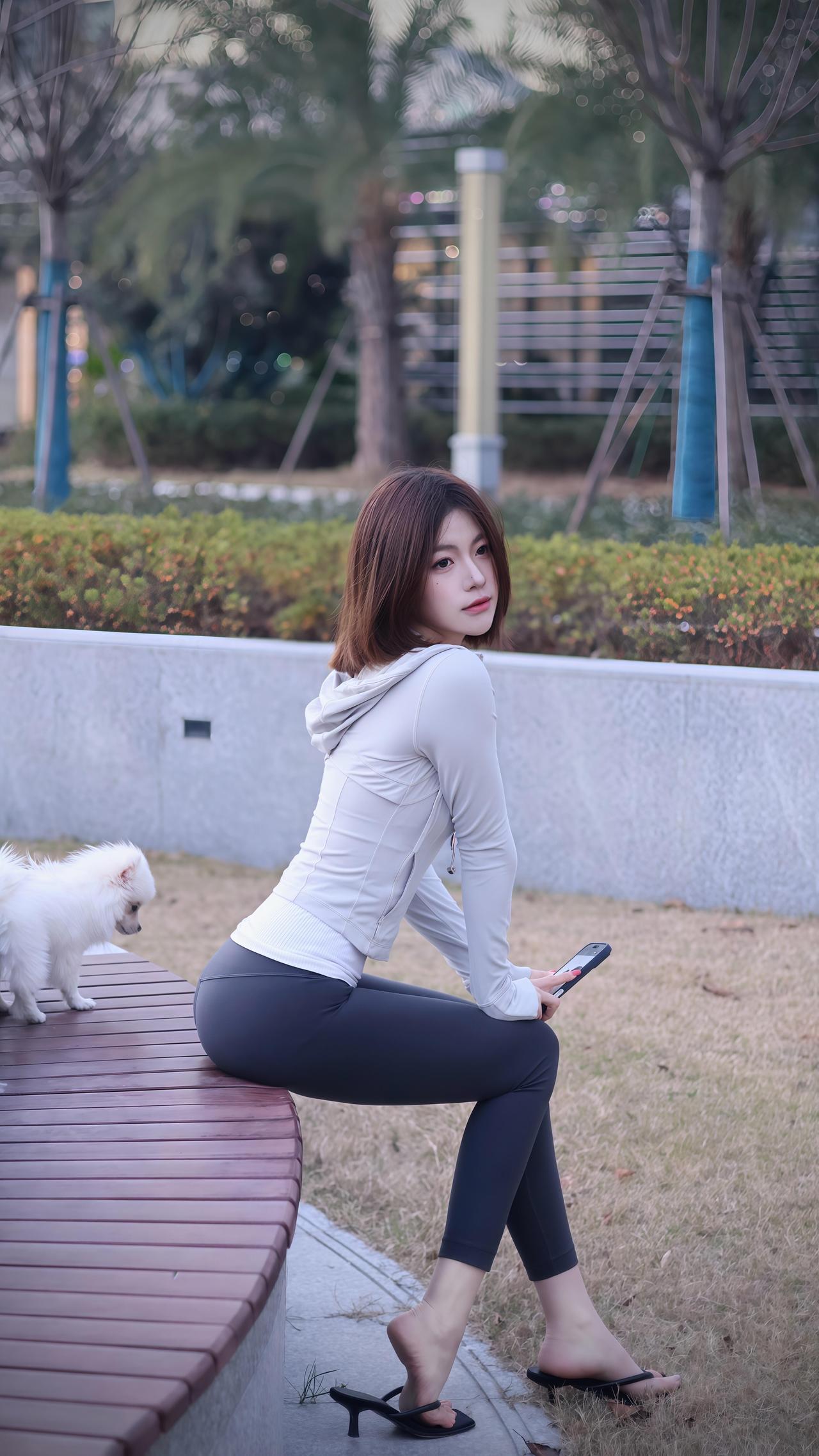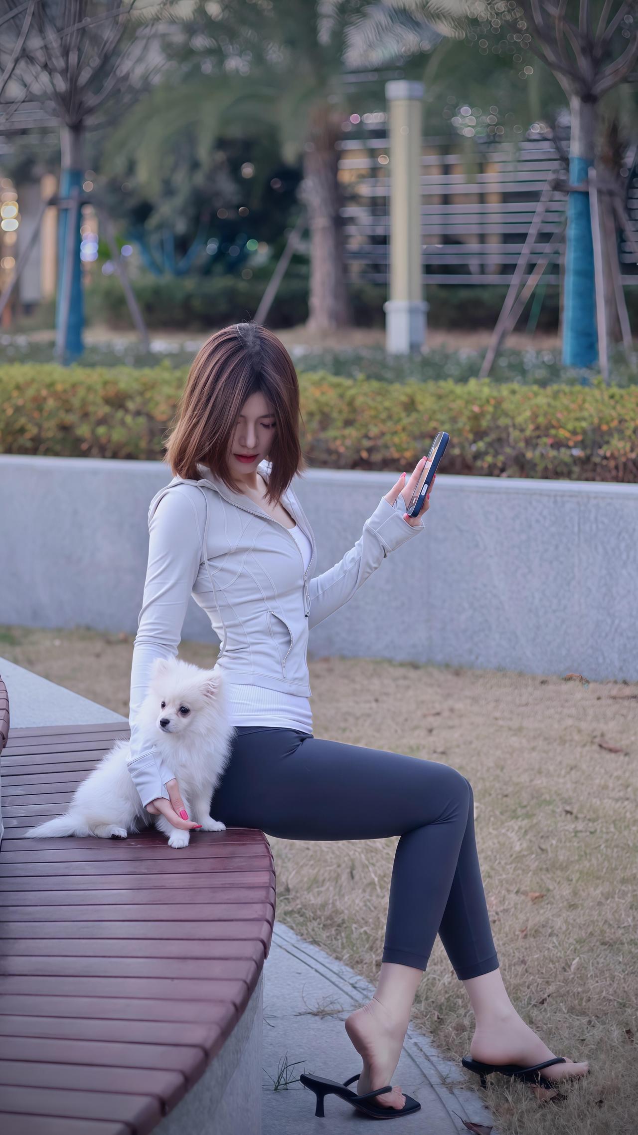 晚风里的闲适 浅灰的外套裹着午后的软, 黑瑜伽裤贴紧腿弯的弧度, 细高跟拖鞋磕着石板路, 没发出声响,却把慵懒揉进晚风里。 木质长椅上,白博美蜷在掌心边, 毛蓬蓬的,像团飘落在手边的云。 她举着手机抬了抬手, 镜头对着天边的霞光, 也对着自己眉眼间的松弛。 抬手舒展肩颈的瞬间, 指尖掠过关不住的晚风, 彩色的地面在身后晕成温柔的圆, 棕榈树的影子晃啊晃, 把绿植墙的纹路揉得更软。 最后坐在石台上的背影, 发梢垂着落日的余温, 小狗在脚边嗅着草叶, 她就那么静着, 像把都市里的匆忙, 都搁在了这片刻的闲适里。