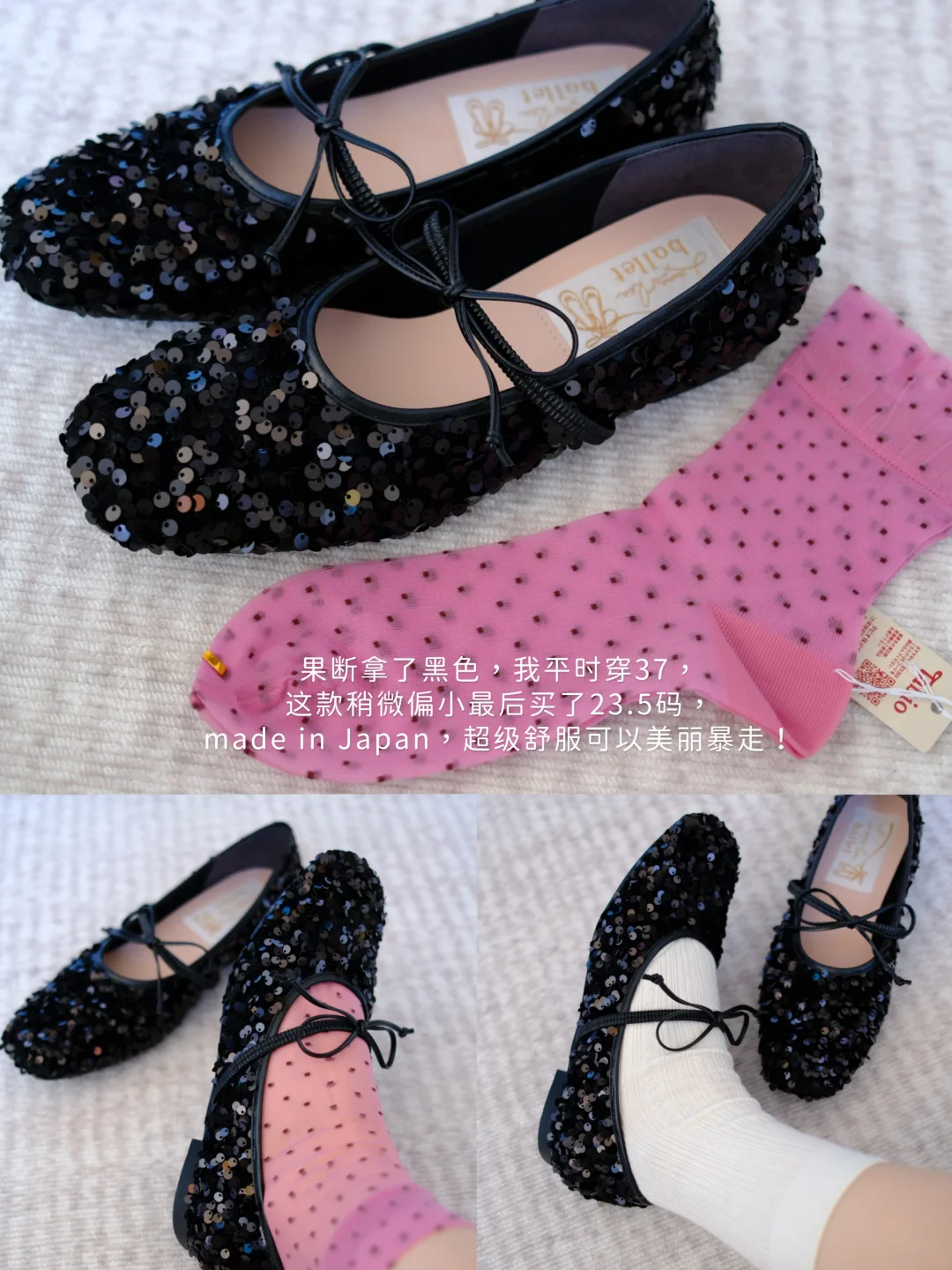 日本本土芭蕾舞鞋,三款颜色,果断拿了黑色,我平时穿37,这款稍微偏小最后买了23.5码,made in Japan,赶上打大折,💰敢信这双才200+???虽然箱子塞不下了也果断入,超级舒服可以美丽暴走!