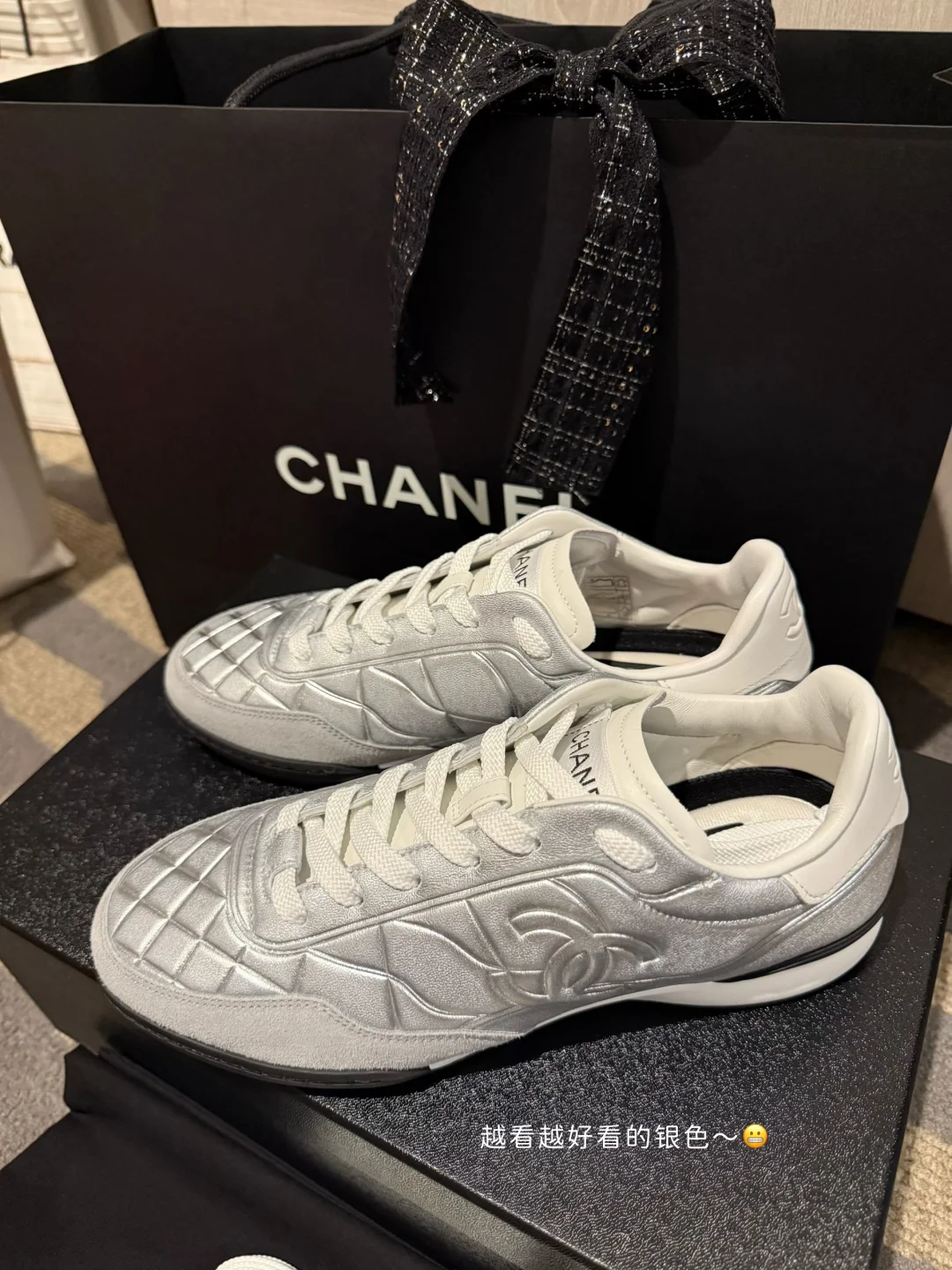 黑白银三个颜色,目标是黑色,可银色上脚实在太好看了,脚底踩在小香的菱格上巨舒服!还收获了很特别的圣诞包装~💰大丸有九五折+4%返现,又送了2000日元的餐券,最近的汇率也很合适。退税选现金最合适,退税手续费1.55%。