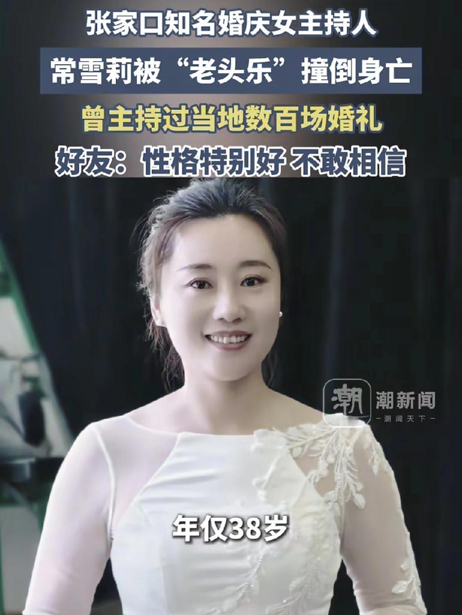从婚礼舞台到致命路口:一名女主持的猝然离世,刺痛了谁的神经? 38岁的女主持人常雪莉突然走了。听说是在张家口被一辆“老头乐”撞的。最后一条视频还是她笑着拍的,七天后人就没了。 这事在网上传开后,很多人都不信。好好的一个人,前一天还在发动态,怎么一下子就出事了。她老公也发了朋友圈悼念,说她走了,家里两个小孩才多大。朋友在评论里说,撞她的是那种老年代步车,没牌子也没驾照,路上到处都是。 她平时是做婚礼主持的,在当地挺有名的。认识她的人都说她人好,性格也好,从不耍大牌。每场婚礼都用心准备,新人找她主持都说特别放心。她还会拍点短视频,记录生活,视频里的她总是笑着的,看着就很阳光。 12月23号那天她还发了一条,镜头对着自己,背景里还能看到几辆代步车来回穿过。谁能想到几天后,她就是被这种车撞倒的。送医院之后抢救了,但没能救回来。那个开车的人据说也没喝酒,就是开着开着就撞上去了。 这种“老头乐”其实挺危险的。速度是不快,可车壳子薄,刹车也差,撞到人基本没啥缓冲。更别说这些车上路都不用驾照,保险也没有,出了事很难扯清。张家口那边管得松,这种车满街跑,大家都习惯了,谁也没当回事。 以前也有过类似的事,别的地方有人晨跑被撞进医院,还有老师被撞骨折的。北京上海开始试点登记和限行,可很多小城市还是没动静。国家一直没定统一标准,管起来也没法可依。想禁吧,老人确实需要代步,不禁吧,安全隐患又在这儿摆着。 她最后一次露面的视频,阳光挺好的,她笑得很自然。监控画面却是冷冰冰的,车一撞,人就倒了。现在再看那段路,还是有好多代步车在穿行,好像什么都没变。 一家人现在就剩丈夫带俩孩子。最小的孩子才上小学,以后问起妈妈,该咋说呢。以前视频还能看看人,现在也只能看看以前拍的东西了。